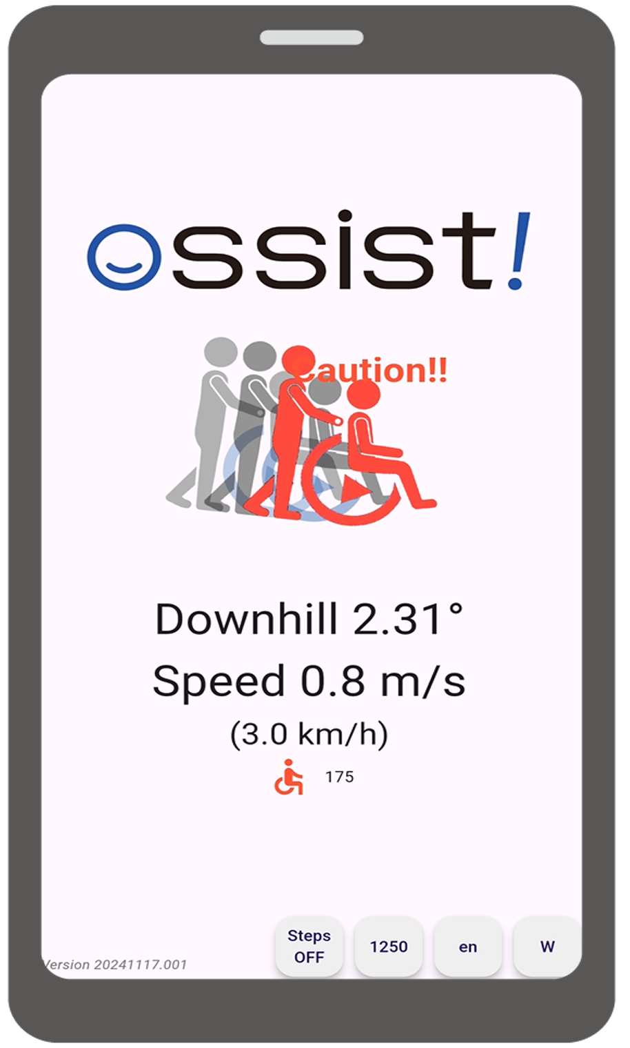 車いすを屋外で押す際のもう一つの課題として、段差などに車輪が引っ掛かって転倒や転落のリスクがあります。現在、スマートフォンのセンサーを利用して路面の凹凸や傾斜を計測して、一定の段差や角度を超えるとお知らせする簡易アプリケーション開発しています。将来的には、押シスト!本体にこのソフトウェアを実装して、車いすで通行にリスクがある場合。その地点を避けたり、速度を下げたり、押す力を増やしたりしたり、路面の状況に応じた対応も可能にして、より安全で安心して車椅子で外出ができるようにします。