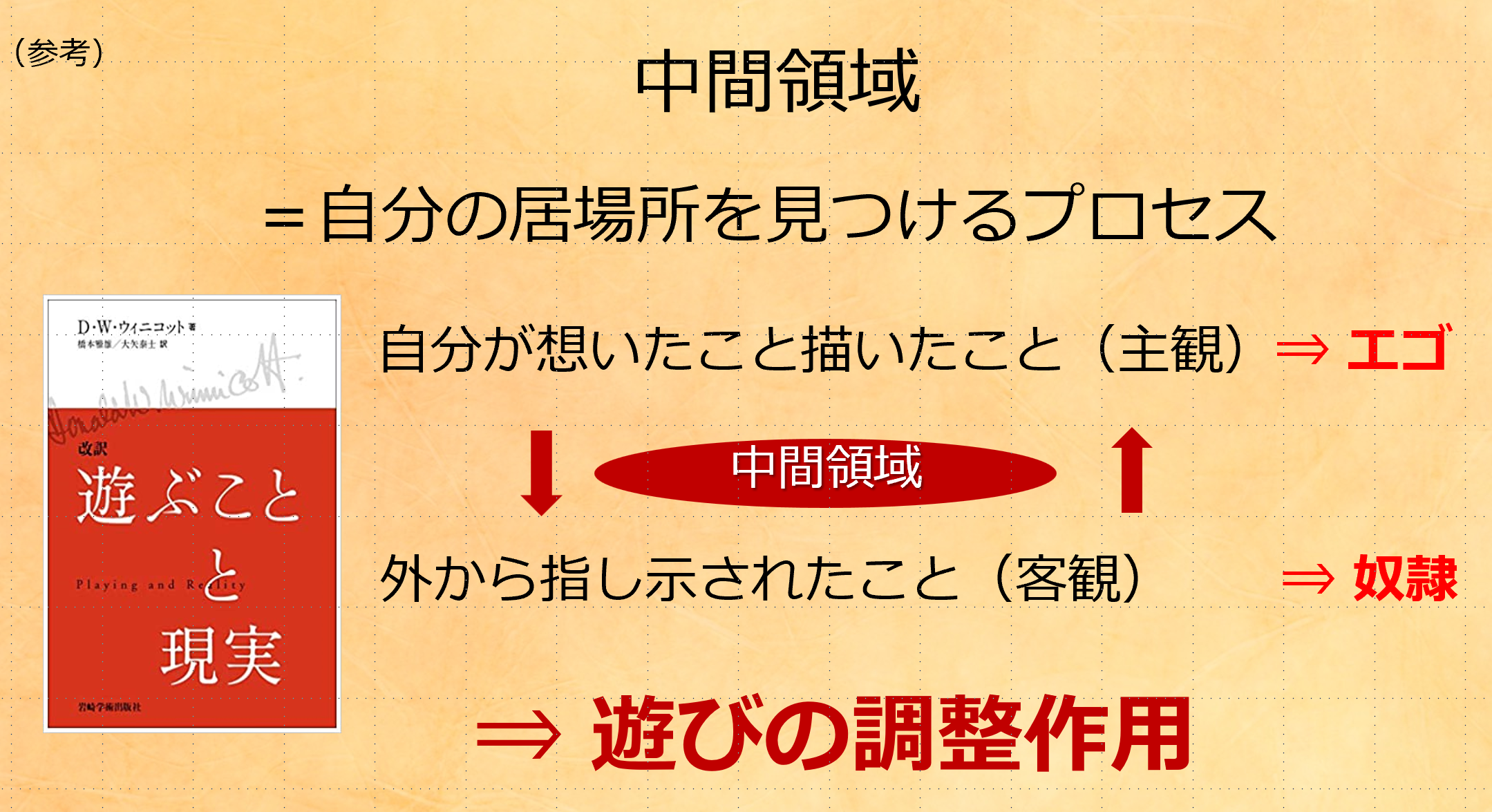 神経分析の本に「遊びと現実」という本があります。そこに出てくる「中間領域」という概念を洞察した時、自分の考えだけで動くエゴと、誰かの指示だけで動く奴隷の間を積極的にさまよい、自分と外部の世界が循環する軸を見つけることが世界全体の回復になる、そのプロセスこそが遊びなのです。