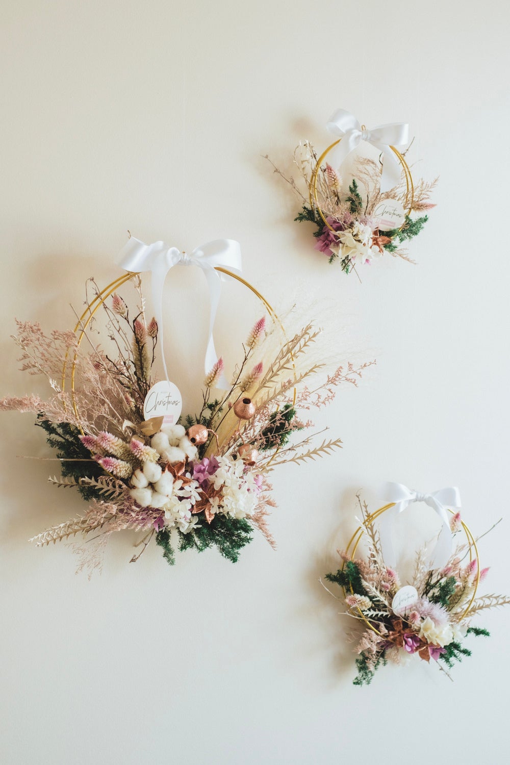 スタイリッシュでクールな印象のダブルゴールドフープを使ったフラワーリース。幻想的なクリスマスを演出する花々を丁寧にあしらっています。