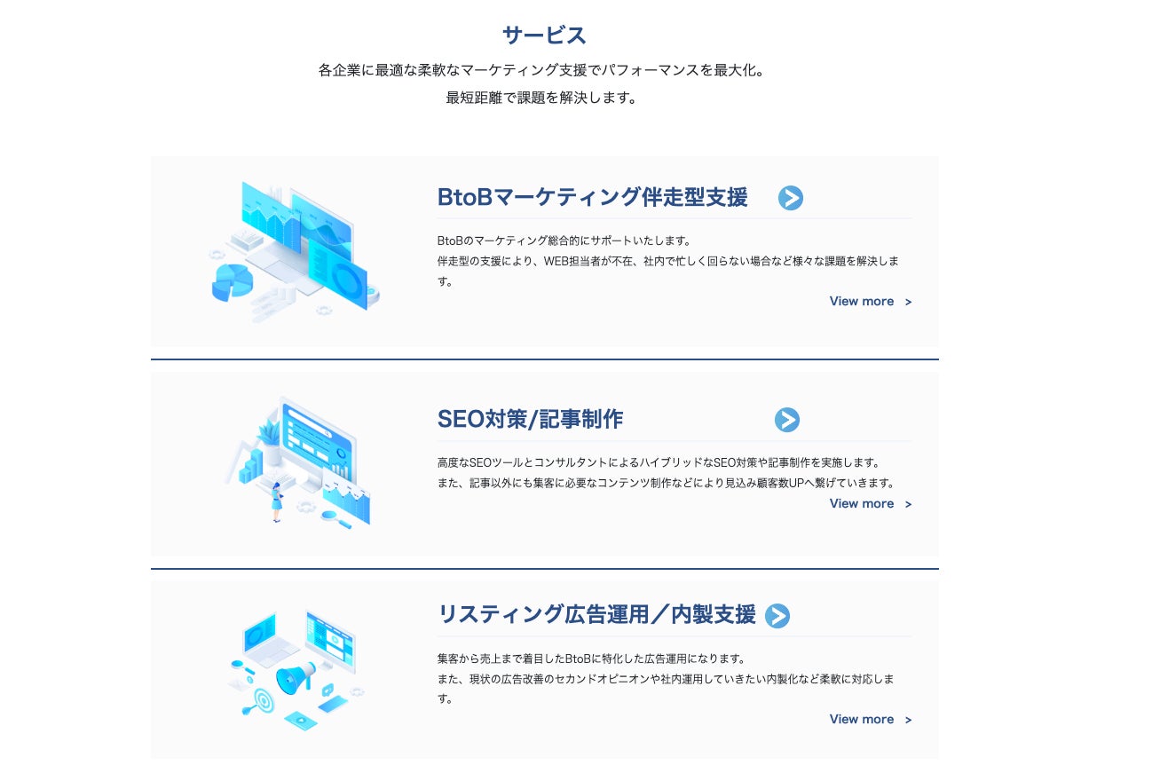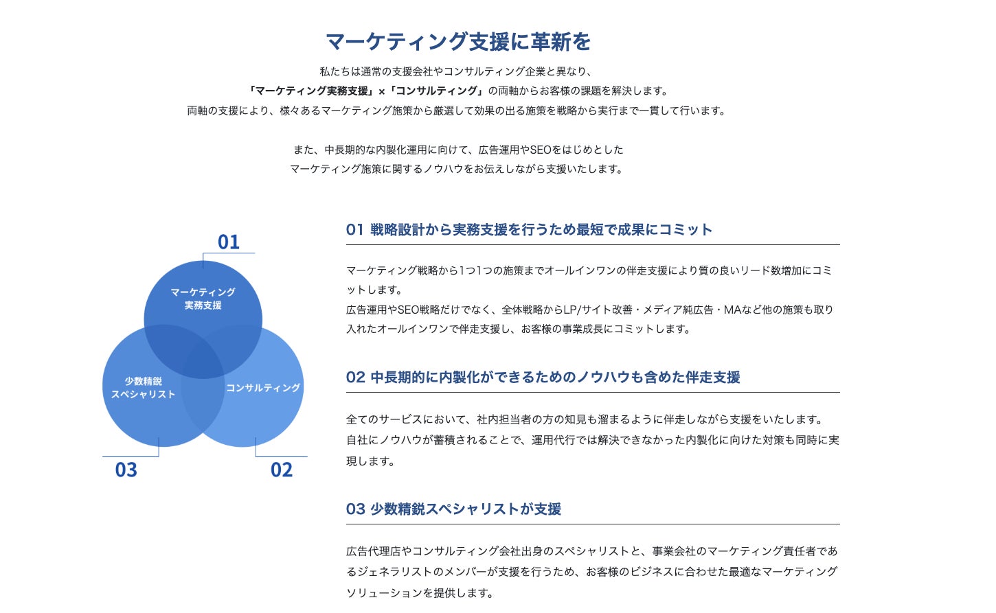 1社1社に最適な「マーケティング実務支援」×「コンサルティング」サービスを両軸とする弊社では、その強みを明記することで、自社の持つ強みを伝えられるよう、改善しました。