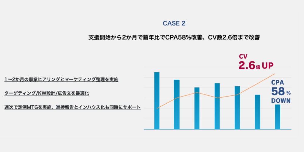 ターゲティング/KW設計/広告文の最適化を行い、CV数2.6倍まで改善を実現しました。また週次で定例MTGを実施、進捗報告とインハウス化も同時にサポートしました。