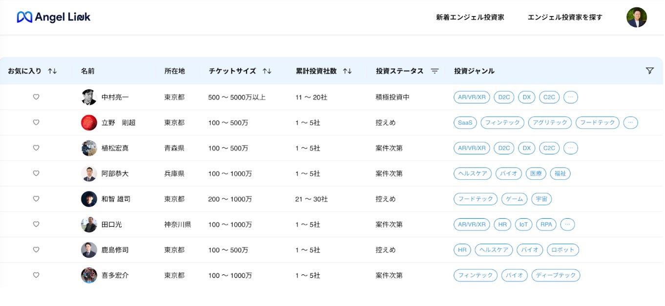 ②起業家がエンジェル投資家を探しやすいよう興味関心のある分野や投資のステータス状況などで絞り込める機能を搭載