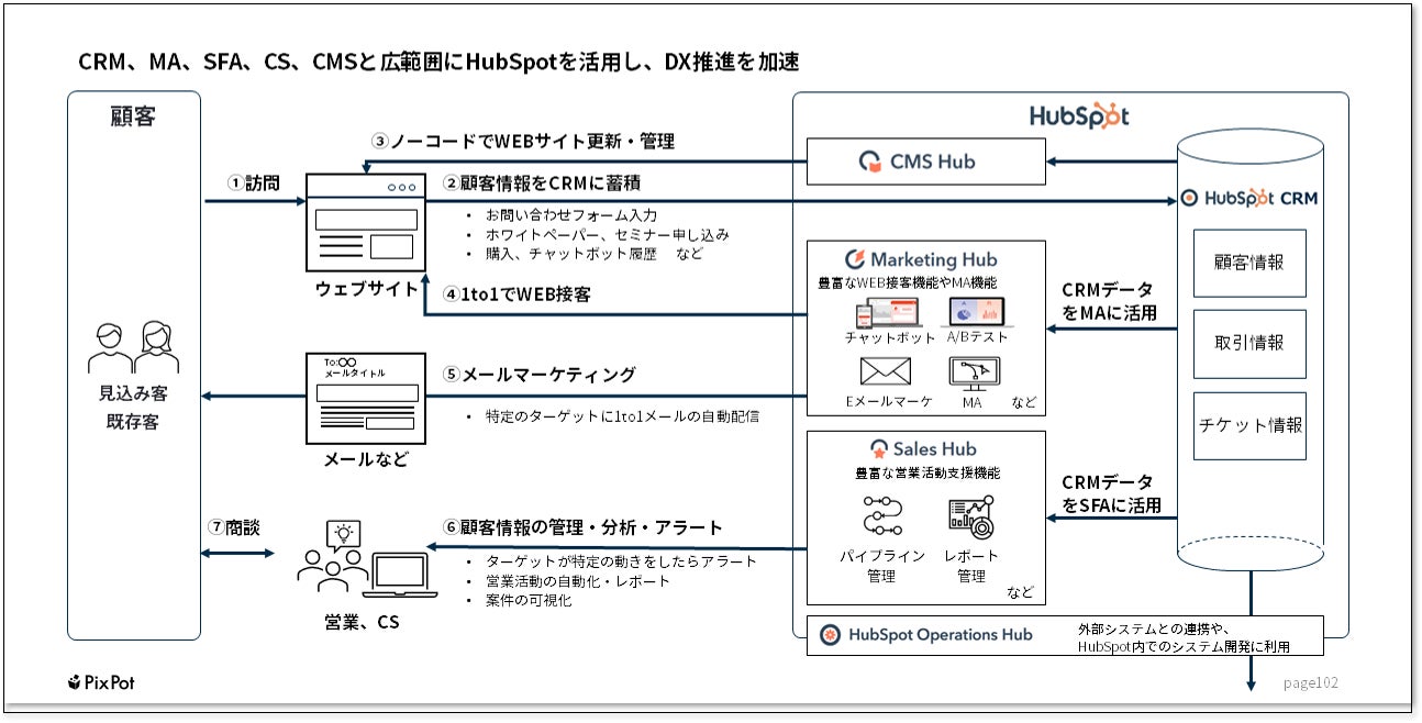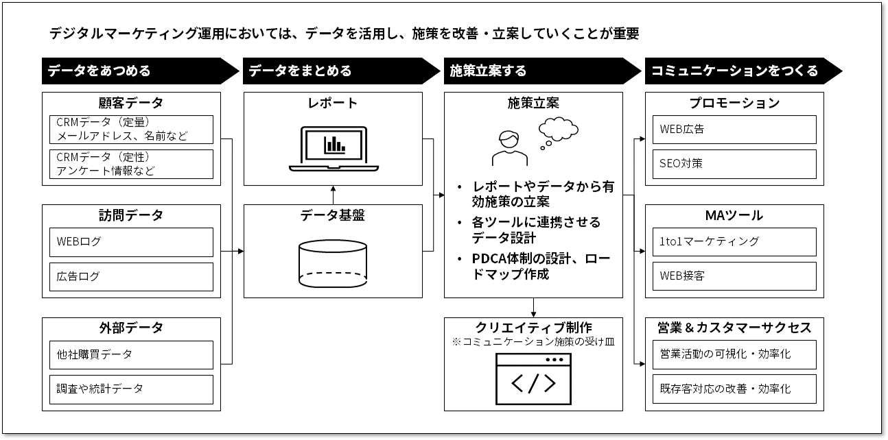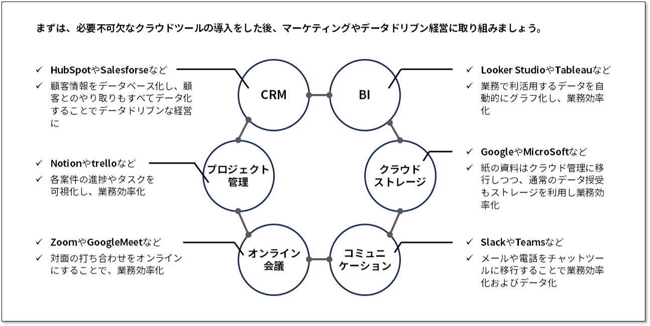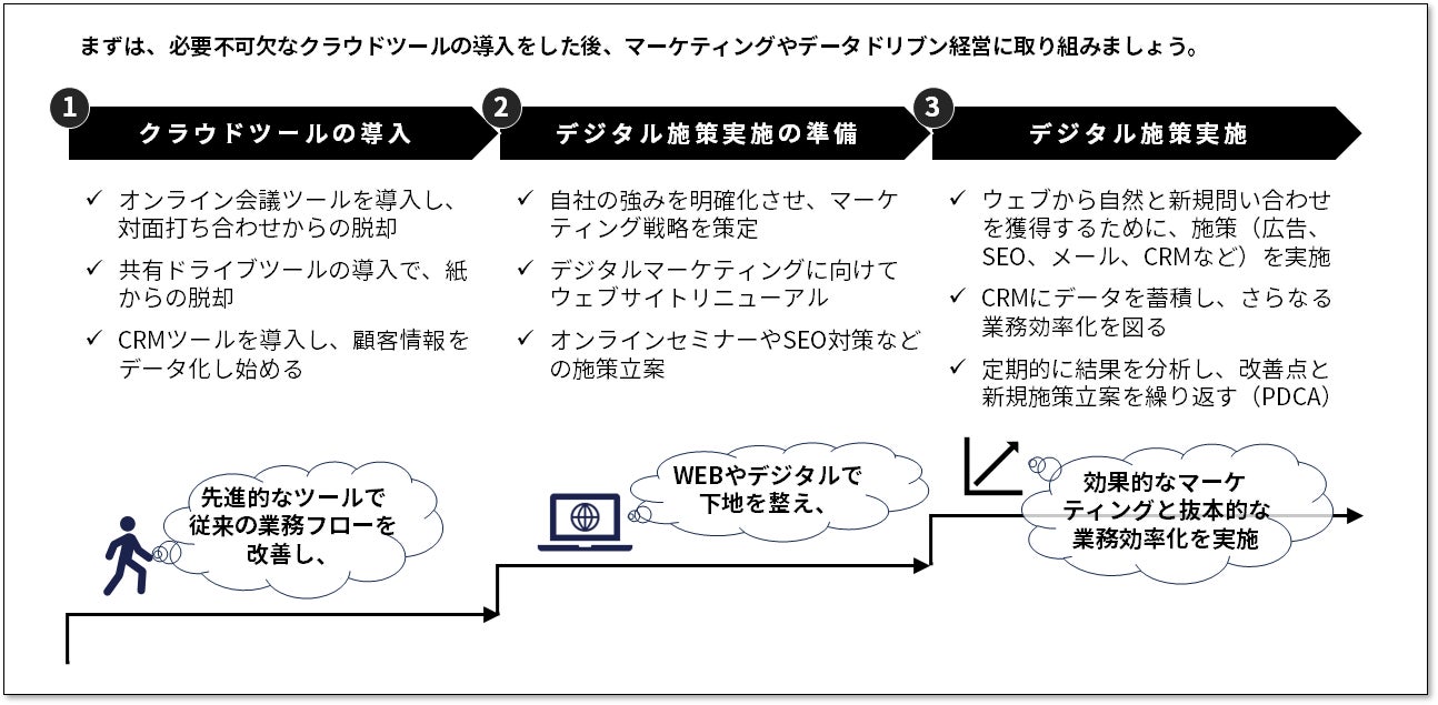 まずは、必要不可欠なクラウドツールの導入をした後、マーケティングやデータドリブン経営に取り組みましょう。 Zoom、GoogleCloud、HubSpotなどの業務の基盤となるデジタルツールを導入し、その後、デジタルマーケティングや、マーケティングオートメーションやSFAの利用をすることが理想のステップです。