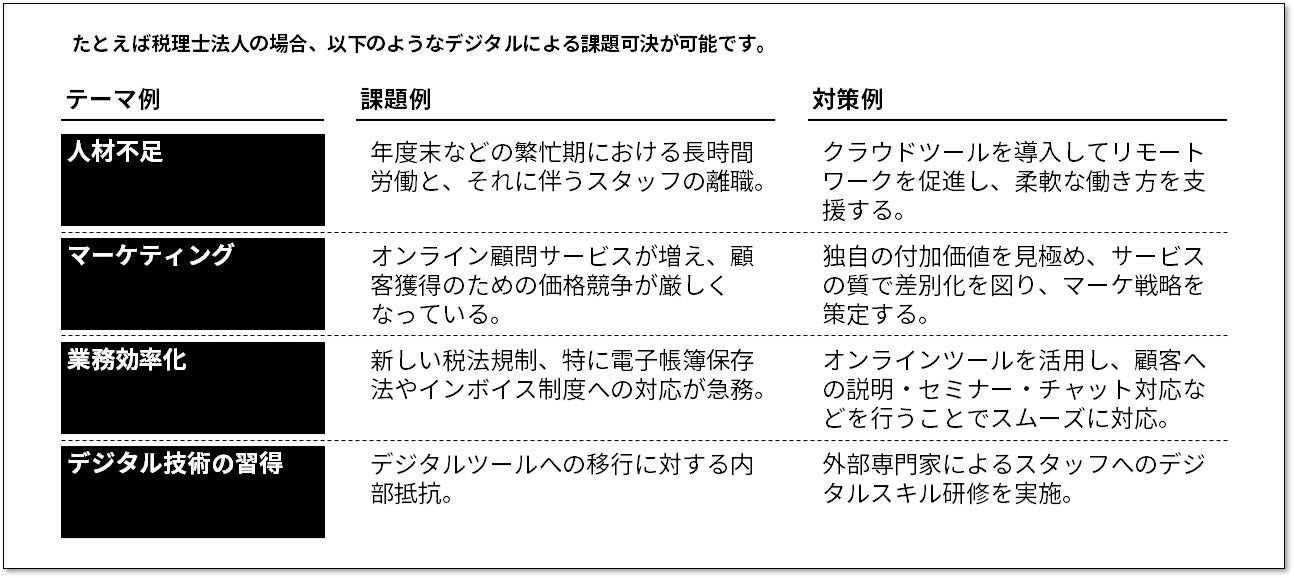 たとえば税理士法人の場合、2023年は電子帳簿保存法やインボイス制度への対応が急務でした。オンラインツールを活用し、顧客へのオンライン説明・オンラインセミナー・チャット対応などを行うことができた税理士法人と出来なかった税理士法人では、サービス品質に大きな差が出たのではないでしょうか。