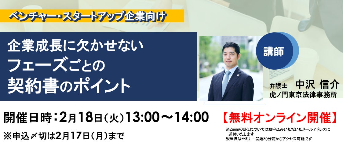 虎ノ門東京法律事務所弁護士 中沢信介は、2月18日(火)13時より、エンジェル・シード期のスタートアップ企業様・経営者の方向けにセミナーを開催いたします。