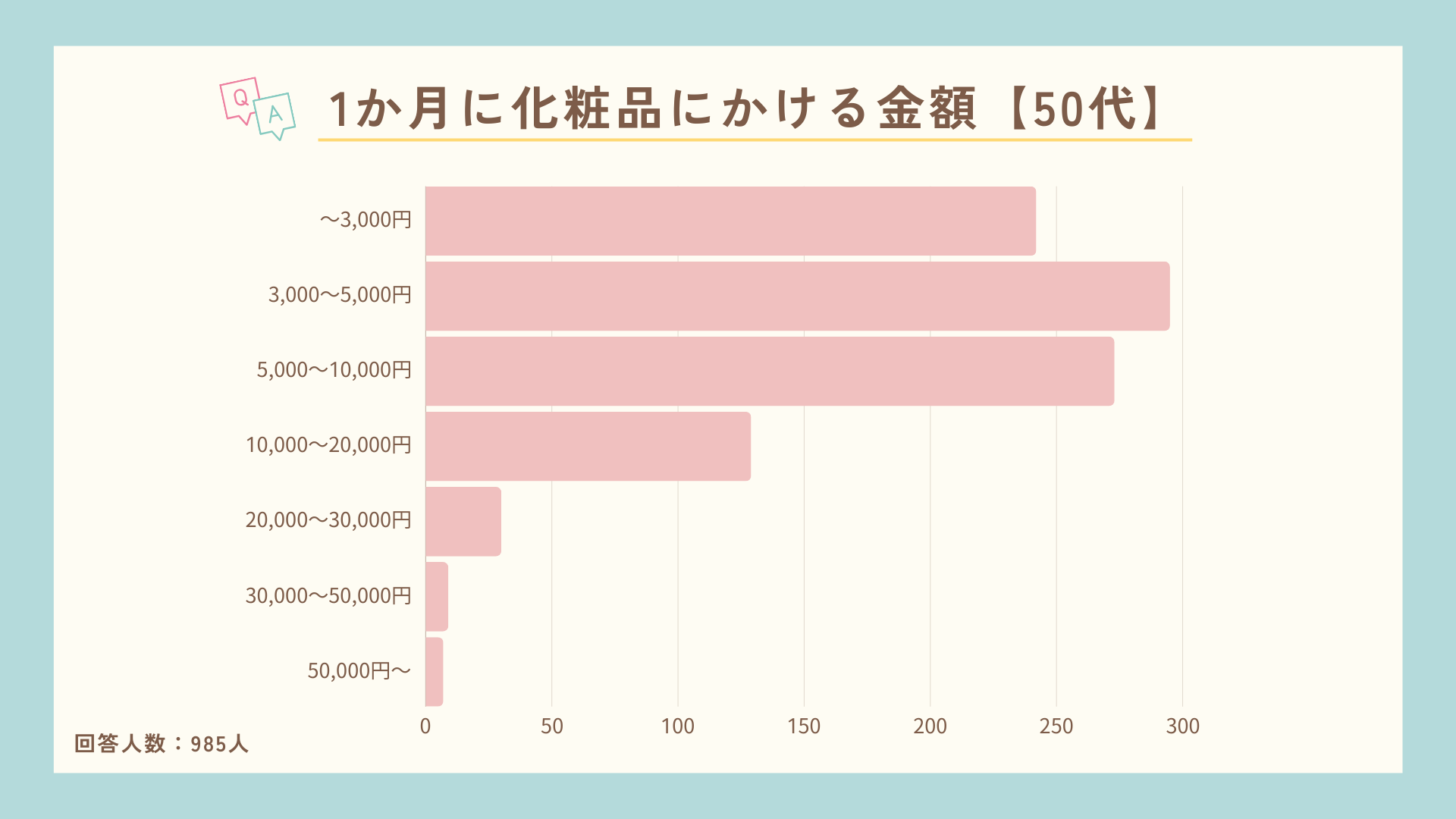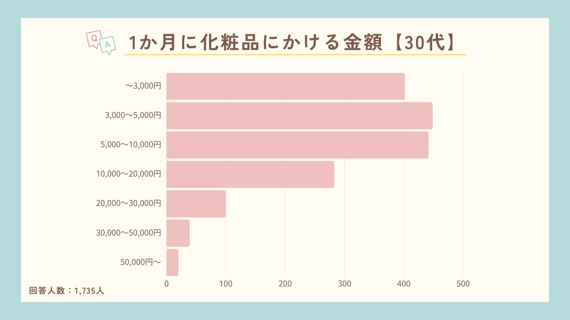 月に化粧品にかける金額調査では、どの世代でも3,000円~5,000円が1位という結果でした。次いで2位が5,000~10,000円、3位が~3,000円となっています。