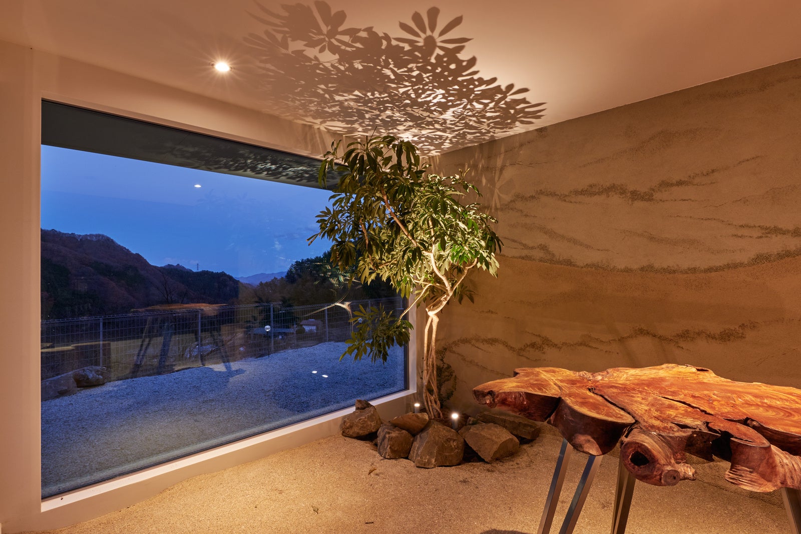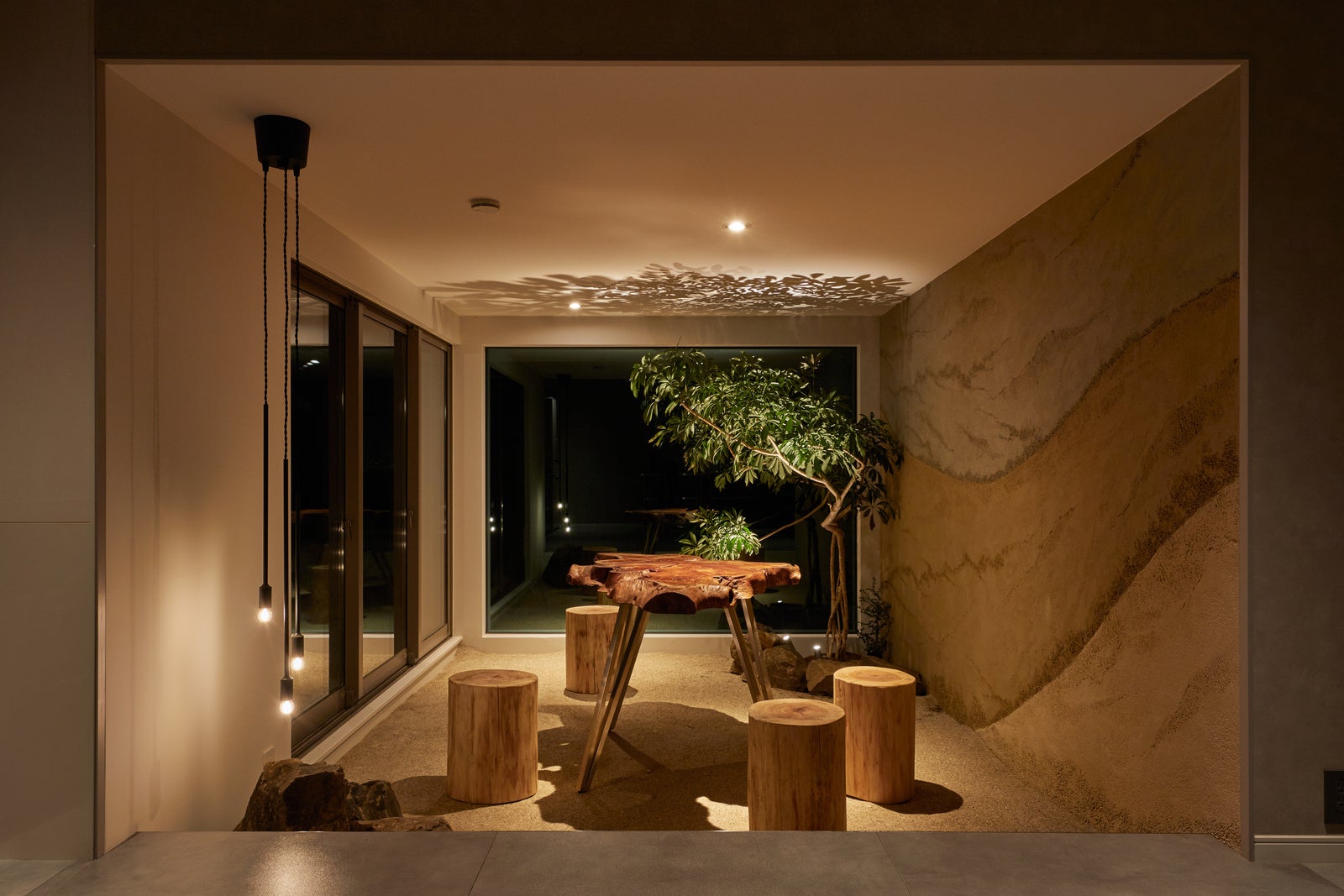 荒船の黒泥色の岩、下仁田ジオパークの地層を彷彿とさせる壁面、鏑材から切り出した丸太チェア、荒船の植生を取り入れた観葉植物。荒船の自然を凝縮したようなサンルームを体験することができます。