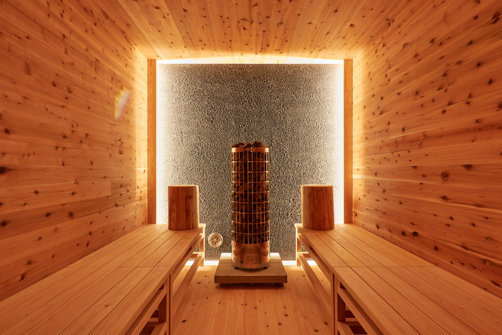 ハルビアのストーブはセルフロウリュ可能。桑の葉のウィスキング、アロマロウリュ、キューゲル、シンギングボールを提供予定。