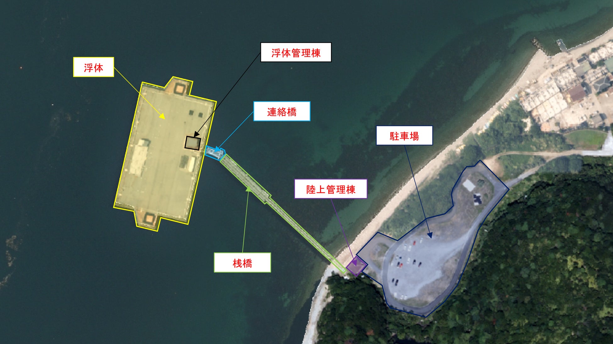 施設:浮体、浮体管理棟、連絡橋、桟橋、陸上管理棟、駐車場