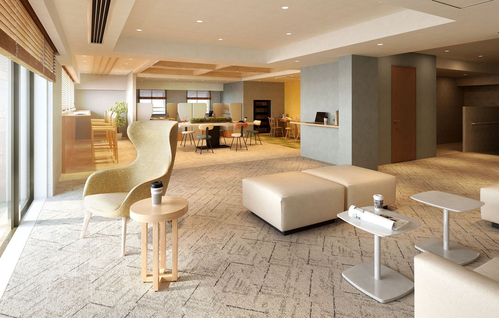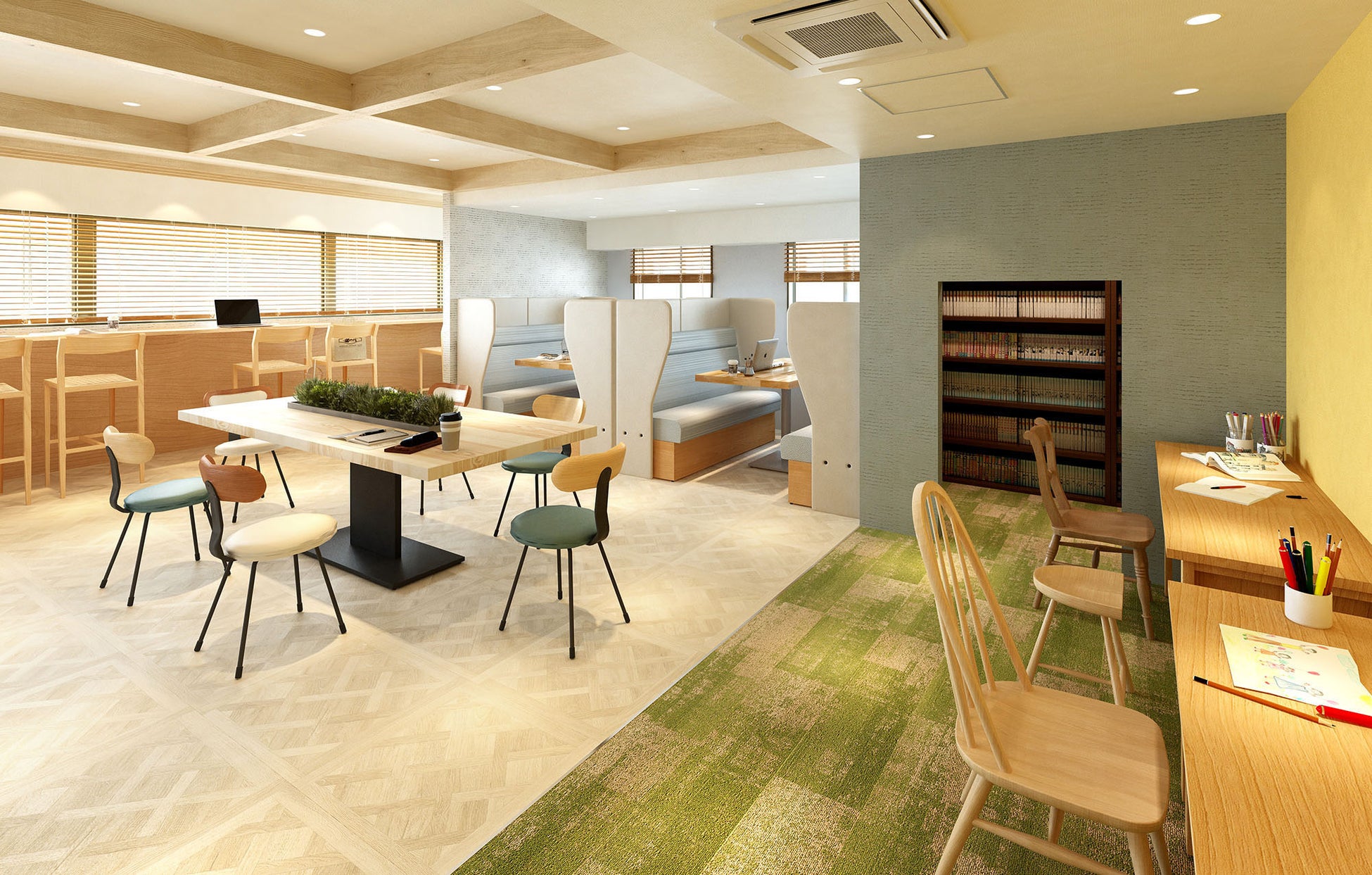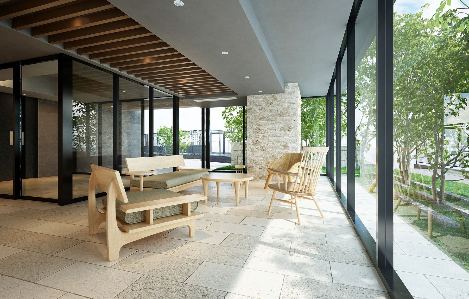 エントランス横には、ガラスウォールが屋内と外部の植栽をつなぐ開放的なラウンジを配置。自然石仕上げの柱や木調ルーバーを設え、多摩産材を使用した家具を用意します。子供が使いやすいサイズの椅子や机、低めのソファを揃え、木の香りが漂う優しい雰囲気の空間をデザイン。外出時に先に家を出てもらってエントランスで待ち合わせをしたり、訪問する友人達を出迎えたりする際に子供も安心して利用することができます。