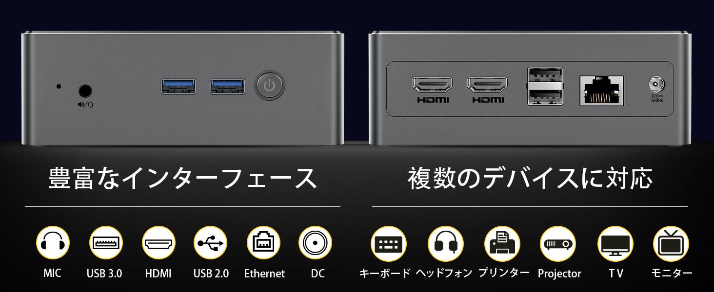 2x USB 3.0 、2x USB 2.0 、2x HDMI 2.0(4K Ultra HD出力)、1xイヤホン/マイクジャック、1xイーサネットポート(1000Mb LANに対応)、1 x DC電源入力ポート、1x RJ45。 また、HDMI*2接続により、最大2台のモニターでマルチディスプレイを構築することができます。 仕事と遊びを同時に、1 台のN95で簡単に実行できます。 2.4+5G Wi-Fi、1000M LANに対応し、ネットワークの高速化とパフォーマンスを保証します。
