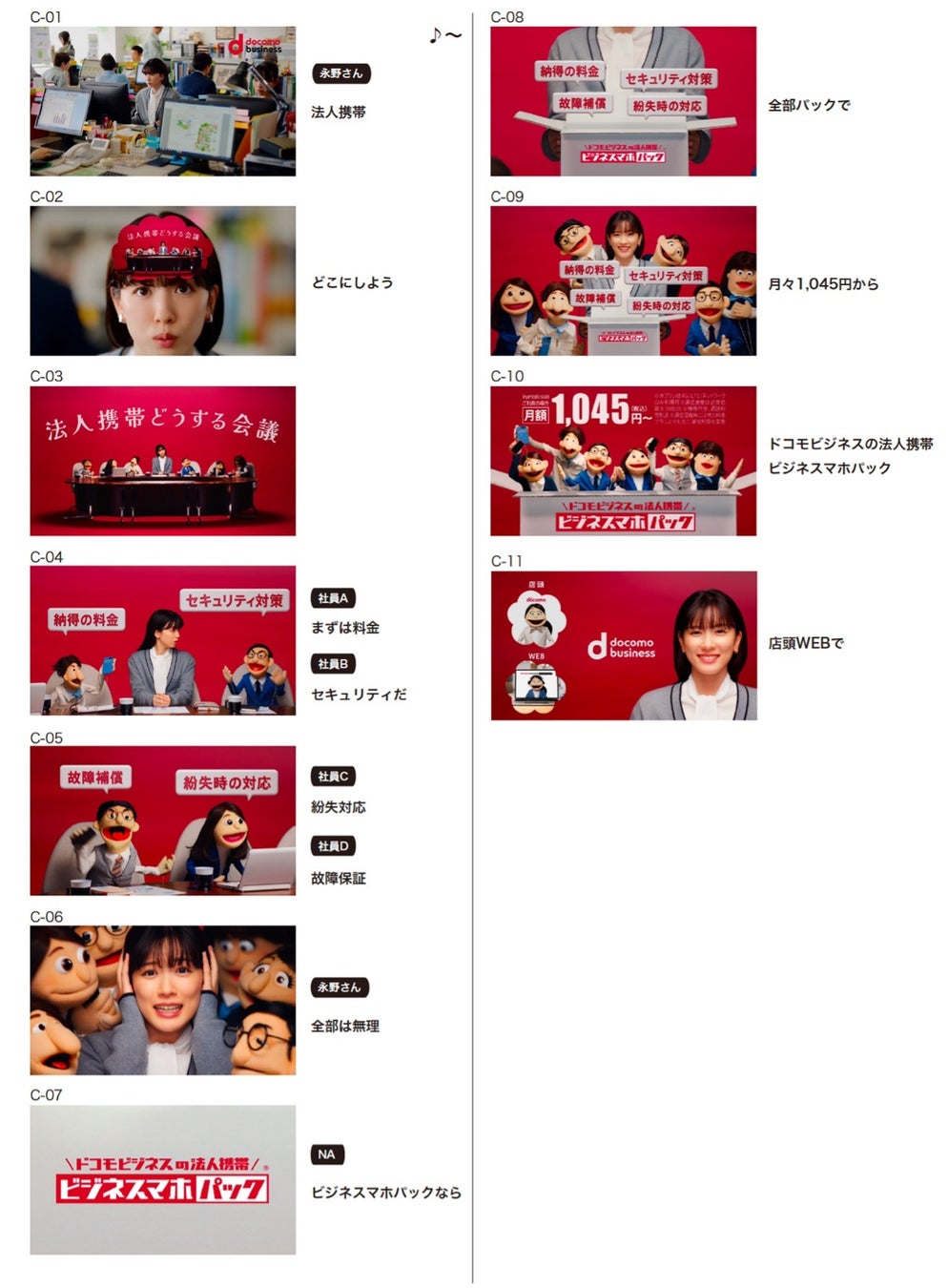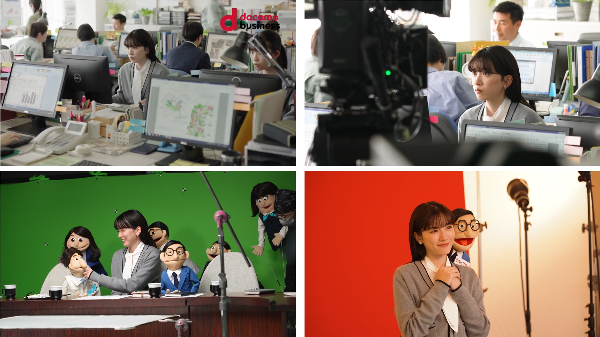 会社員として、法人携帯の導入担当者役に扮する永野芽郁さんと、マペット扮する、経営層、管理職、情報システム担当、現場社員らが、それぞれの立場から、法人携帯に求めることや、DXに期待することを永野さんの脳内で激しく議論を交わします。料金、セキュリティ、紛失、故障など全員の意見を聞いて困り顔の永野さん。ドコモビジネスの「ビジネスマホパック」で全てが叶うことを知り笑顔を見せました。