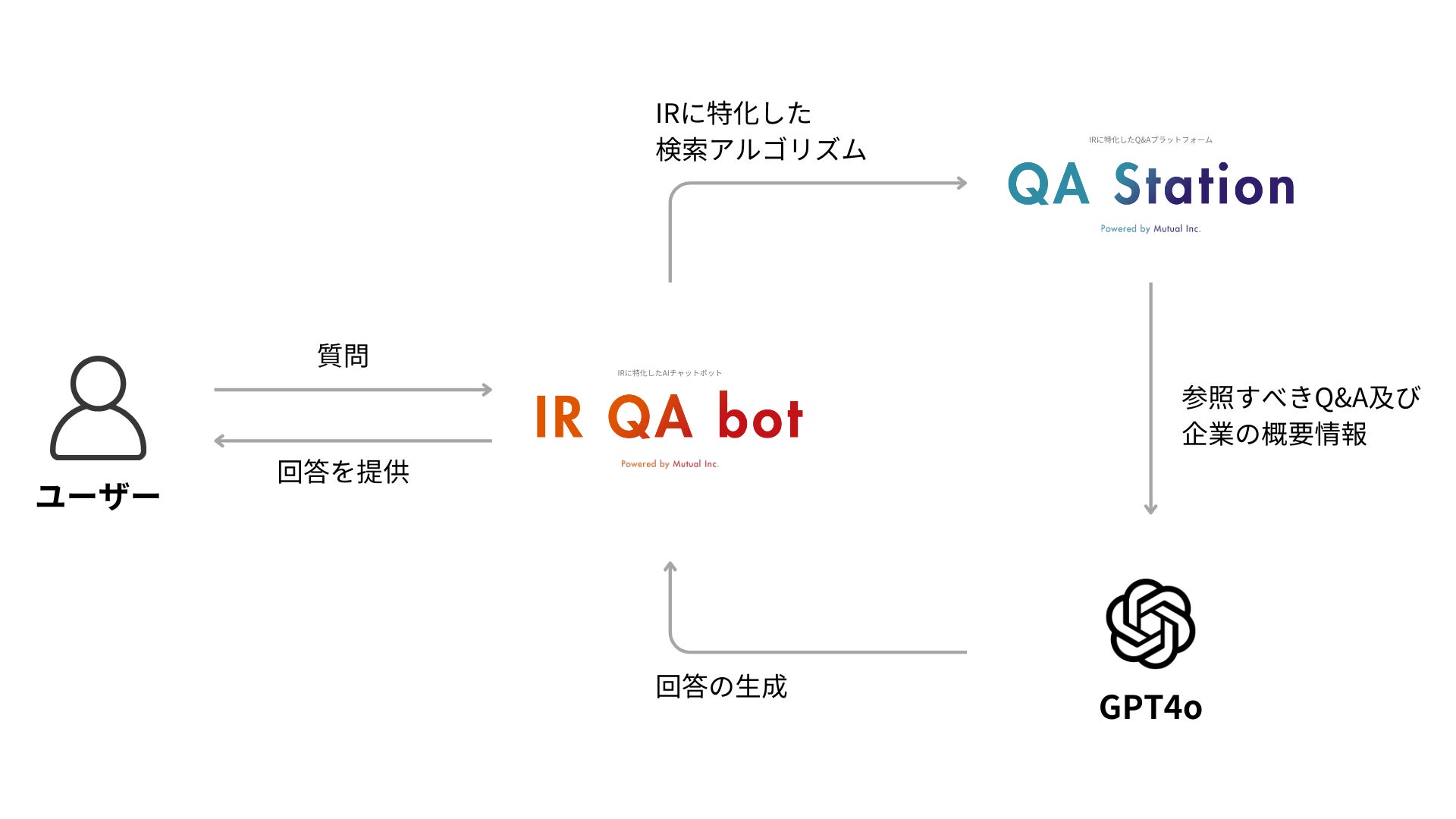 本日、両社の取り組みの成果として「IR QA bot(β版)」をリリースするに至りました。IR QA botは、GPT4oをベースとしつつ、QA Station内の質疑応答の情報を検索する仕組みやその他独自のアルゴリズムを組み込むことで、各社の個別事情を踏まえた回答を自動生成することを実現しています。た。