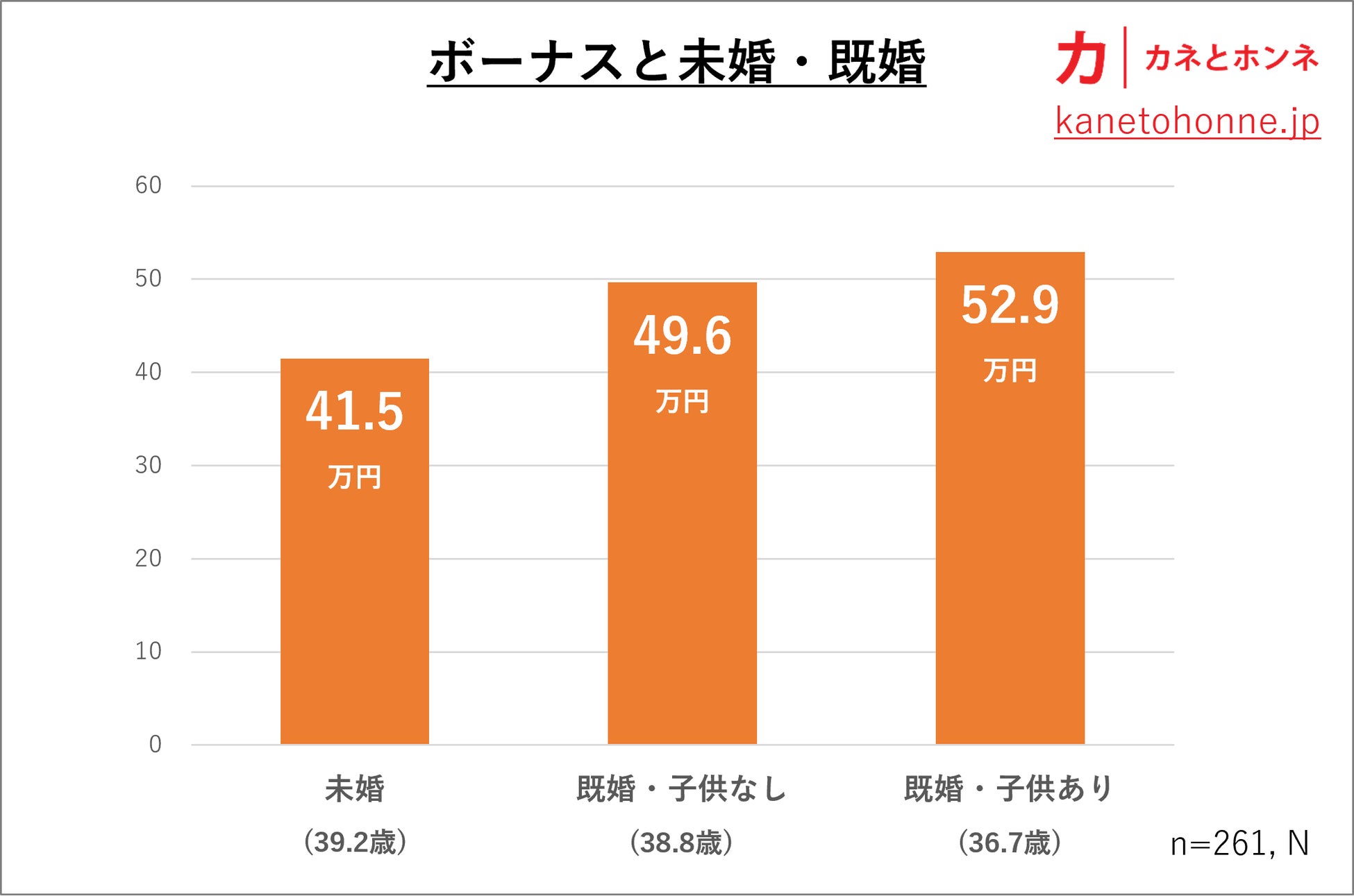 未婚者と既婚者でボーナスの見込み金額を比較すると、未婚者は41.5万円、既婚者は子供なしで49.6万円、子供ありで52.9万円。未婚者のボーナスは既婚者の約8割であることが分かりました。