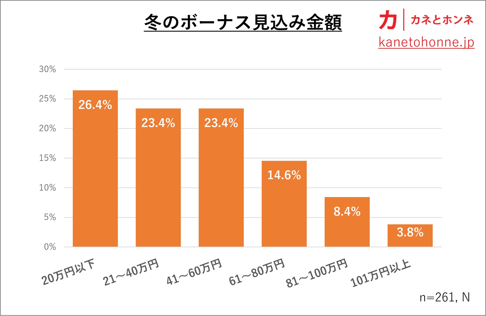ボーナスの分布をみると、その金額は低い層に偏っており、20万円以下がもっとも多く26.4%でした。サラリーマンの4人に1人は心細い思いをしているのかもしれません。
