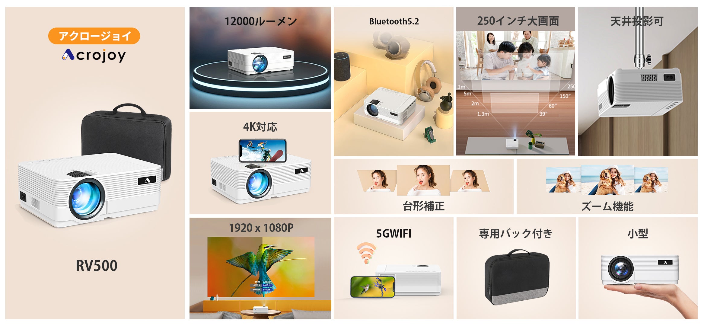 スペック紹介:小型/12000ルーメン/4K対応/Bluetooth5.2/1920 x 1080P/250インチ大画面/5GWifi/天井投影可/ズーム機能/台形補正/専用バック付き