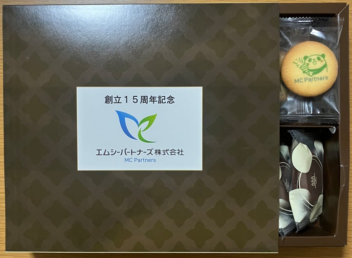 15周年を記念して、派遣スタッフを含む当社従業員にオリジナルキャラクター、エムシーぱ~んだのクッキーセットとサーモスステンレスボトルをプレゼントしました。