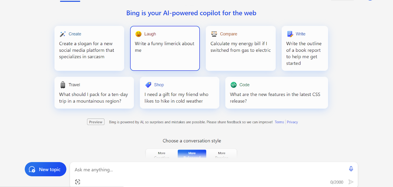Bing の AI は、詩や物語の作成をしたり、画像を生成したりするクリエイティブなアシストも可能です。また、検索エンジンの使いやすさと AI のインテリジェンスを組み合わせて、Web 全体からの回答を要約することで、新しい Bing を情報タスクにもクリエイティブ タスクにも対応できる多用途ツールとなっています。