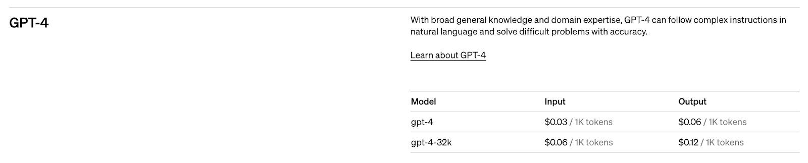 さらに、GPT-4 をシステムに統合することに関心のある開発者は、使用量に応じて価格設定された API を使用できます。テキストのみの GPT-4 API の料金は、プロンプト トークン 1,000 個あたり 0.03 ドル、コンプリーショントークン 1,000 個あたり 0.06 ドルからです。より長いコンテキスト長を必要とする作業には、より広範なオプションである gpt-4-32k も用意されており、価格はプロンプト トークン 1,000 個あたり 0.06 ドル、コンプリーショントークン 1,000 個あたり 0.12 ドルです。