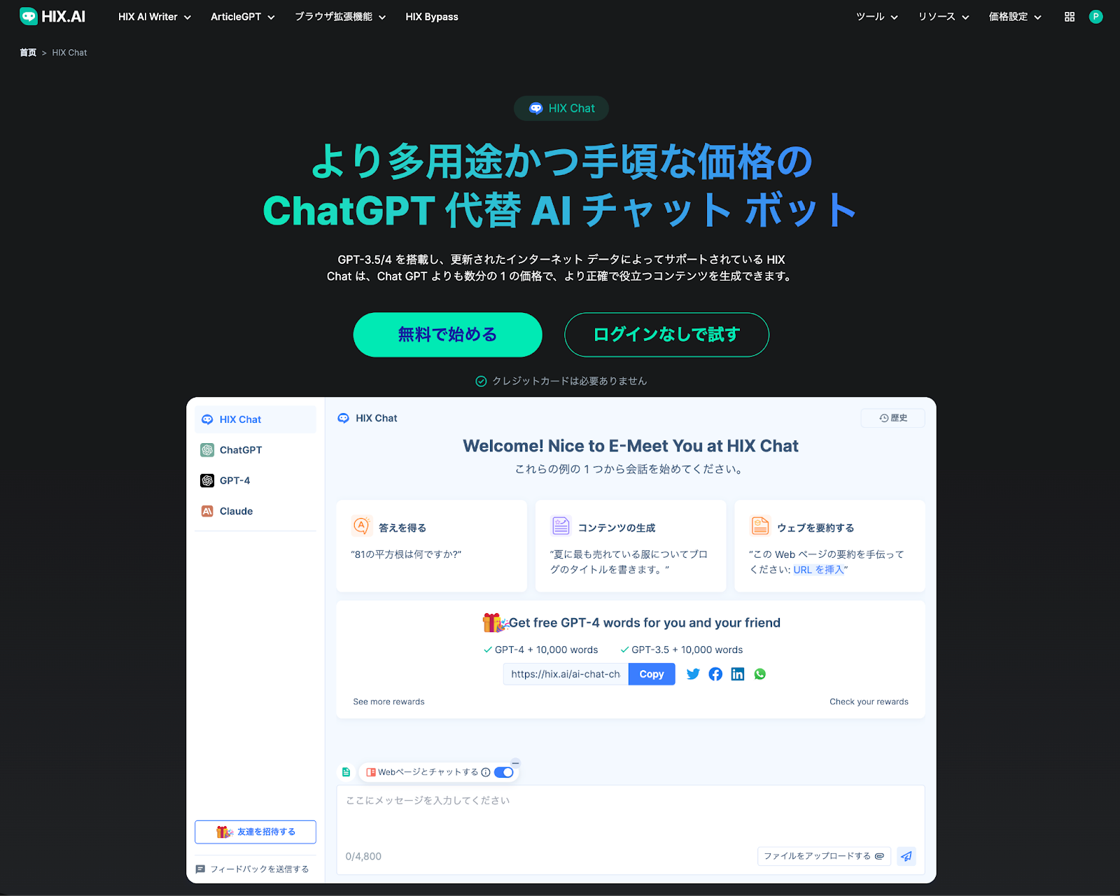 GPT-4 と同様の AI の機能を熱望する人にとって、HIX Chat は、アクセスしやすく、安定した効率的なプラットフォームを提供します。 HIX Chatを使用すると、ユーザーはサブスクリプション料金やアカウント作成なしで高度な AI 機能を利用することができます。AIとのコミュニケーションをシームレスかつで便利に行うことができる理想的な選択肢となるでしょう。