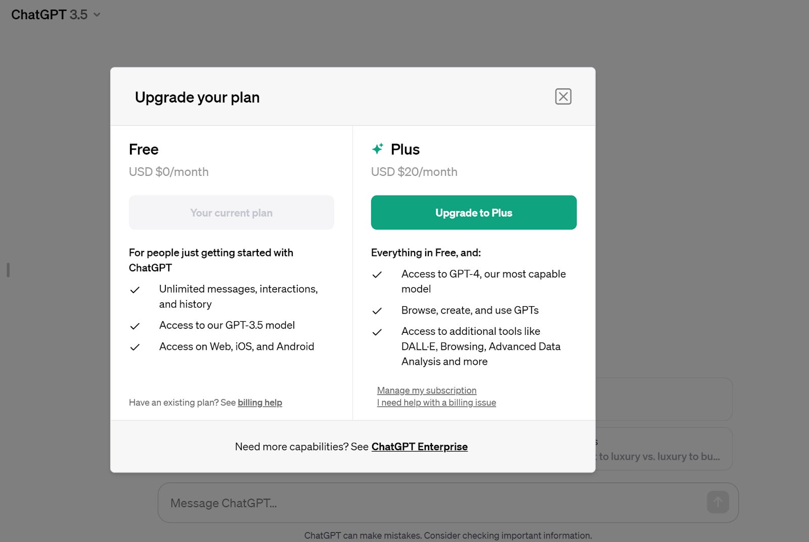 GPT-4 のより高度な機能を利用したい場合は、有料版へアップグレードが必要です。 ChatGPT Plus として知られるこのアップグレードには、月額 20 ドルの費用がかかります。処理能力の向上や最新のアップデートを含む、GPT-4 の全機能を利用できるようになりますへ。