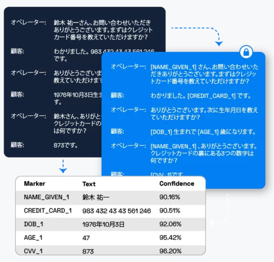 Private AIはユーザーが大規模言語モデル(LLM)に情報を入力する際、また自社データを使ってモデルのファインチューニングをする際に、独自の機械学習アルゴリズムを活用して機密情報や個人を特定できる情報(以下PII)を自動的に編集し、データプライバシーを確保したAIの利用を可能にする技術を開発しています。このサービスは、日本語を含む53か国の言語に対応し、50以上のデータ種別に対応しています。特筆すべきは、単なるルールベースではなく、大量のデータでトレーニングされたAIによってPIIを検出しており、その精度が非常に高い点です。さらに、Private AIはPIIだけでなく、個人保健情報(PHI)やクレジット情報(PCI)など、高度な機密性を要する情報にも対応しています。また、日本独自のデータ種別(マイナンバーや日本の住所など)にも対応しています。これにより、国際的かつ多岐にわたる利用環境で、高いデータプライバシーを確保しながらAIテクノロジーの恩恵を最大限に享受できる点がPrivate AIの強みとなっています。