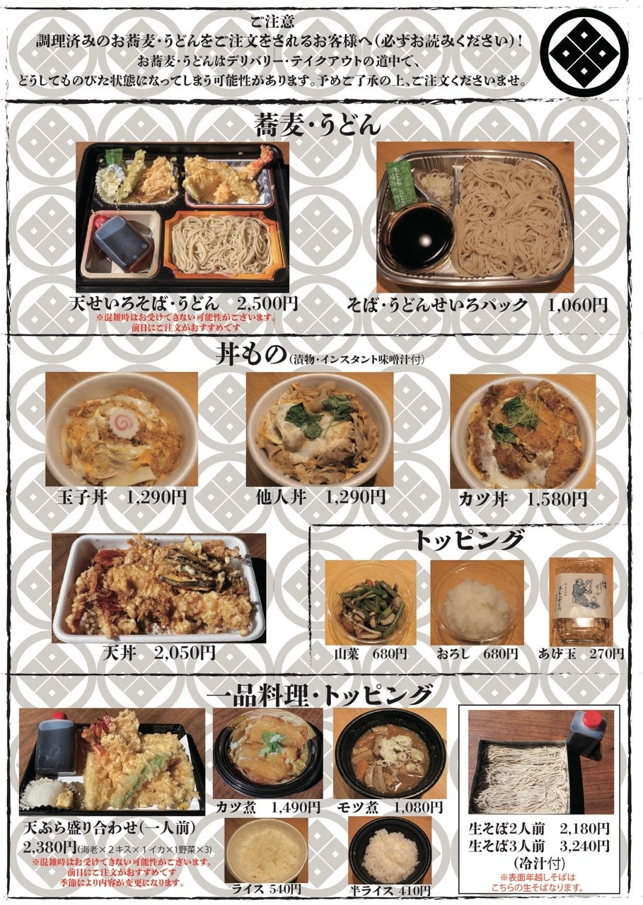 2023年11月より、手作りのそば・うどんを始め、カツ丼や天丼、天せいろなどのテイクアウト・デリバリーが可能になりました。