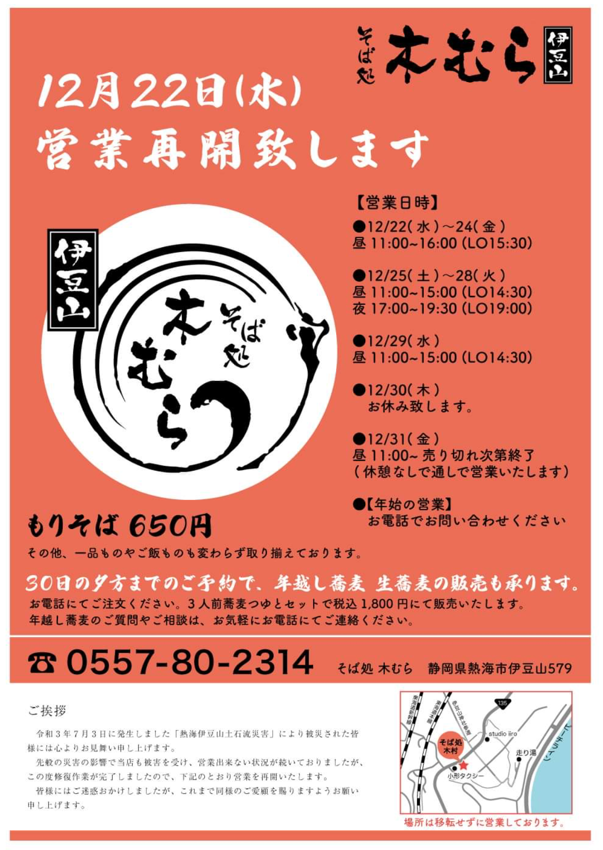 2021年7月に起こった熱海市伊豆山土石流災害は「伊豆山そば処木むら」にも被害をもたらし、災害発生地から近かったこともあり、お店を営業できない日が続きました。しかし同年末には伊豆山地区のお店の中でも、いち早く営業を再開し地域全体を強く励ましました。