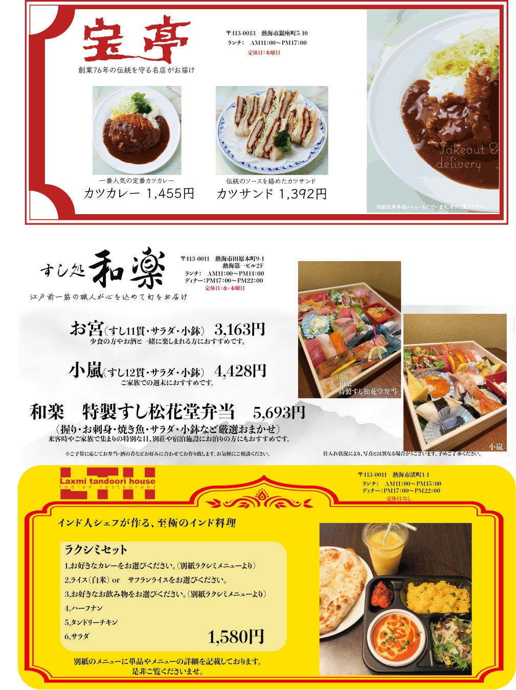 東京出身の伊藤悠が2022年11月に運営会社を設立し、翌年2023年6月よりサービスの試験運用を開始しました。今回提携販売をスタートした「伊豆山 そば処 木むら」や、「宝亭」といった老舗飲食店の他、熱海第一ビル内で密かに人気を博す「すし処 和楽」や2021年末に開店した「Laxmi tandoori house」など熱海の穴場的飲食店との提携、デリバリーサービスの提供を行なってきました。