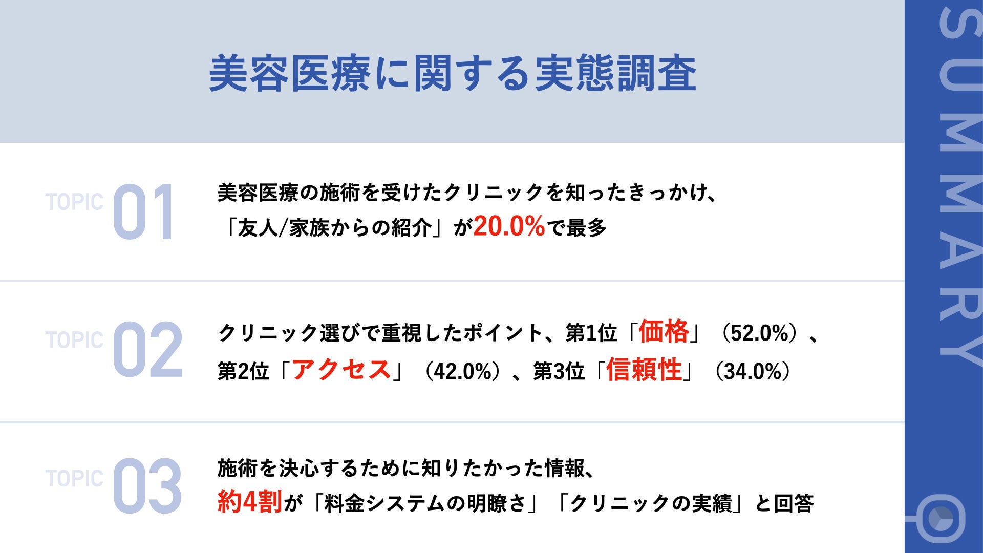 今回の調査では、美容医療に対する意識やクリニック選びの実態が明らかになりました。患者の多くが、施術前は美容医療に対して心理的なハードルを感じていたようです。美容医療を受けるクリニック選びにおいては、施術費用やアクセスの良さだけでなく、クリニックの信頼性の高さ、心理的サポートの提供が決め手になるのではないでしょうか。