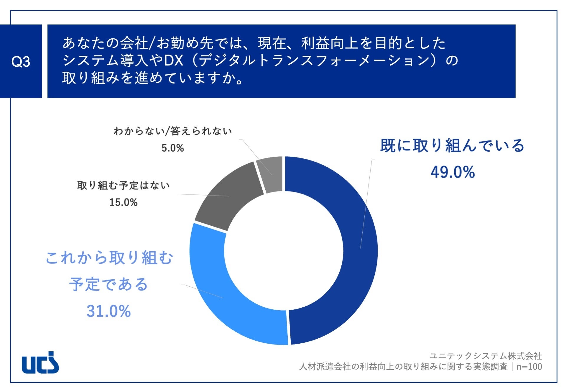 「Q3.あなたの会社/お勤め先では、現在、利益向上を目的としたシステム導入やDX(デジタルトランスフォーメーション)の取り組みを進めていますか。」(n=100)と質問したところ、「既に取り組んでいる」が49.0%、「これから取り組む予定である」が31.0%という回答となりました。