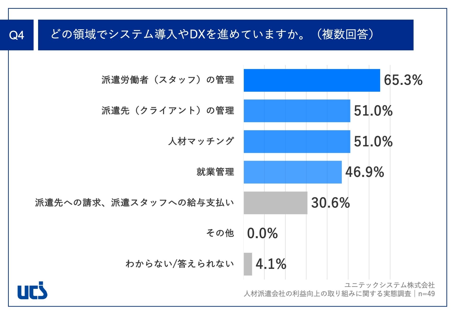 Q3で「既に取り組んでいる」と回答した方に、「Q4.どの領域でシステム導入やDXを進めていますか。(複数回答)」(n=49)と質問したところ、「派遣労働者(スタッフ)の管理」が65.3%、「派遣先(クライアント)の管理」が51.0%、「人材マッチング」が51.0%という回答となりました。