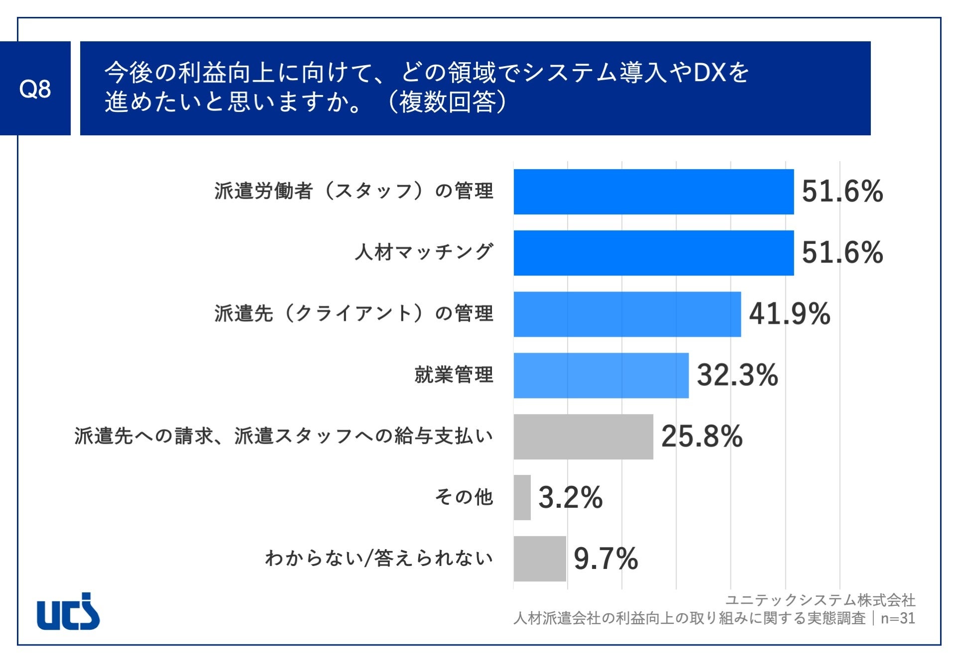 Q3で「これから取り組む予定である」と回答した方に、「Q8.今後の利益向上に向けて、どの領域でシステム導入やDXを進めたいと思いますか。(複数回答)」(n=31)と質問したところ、「派遣労働者(スタッフ)の管理」が51.6%、「人材マッチング」が51.6%、「派遣先(クライアント)の管理」が41.9%という回答となりました。