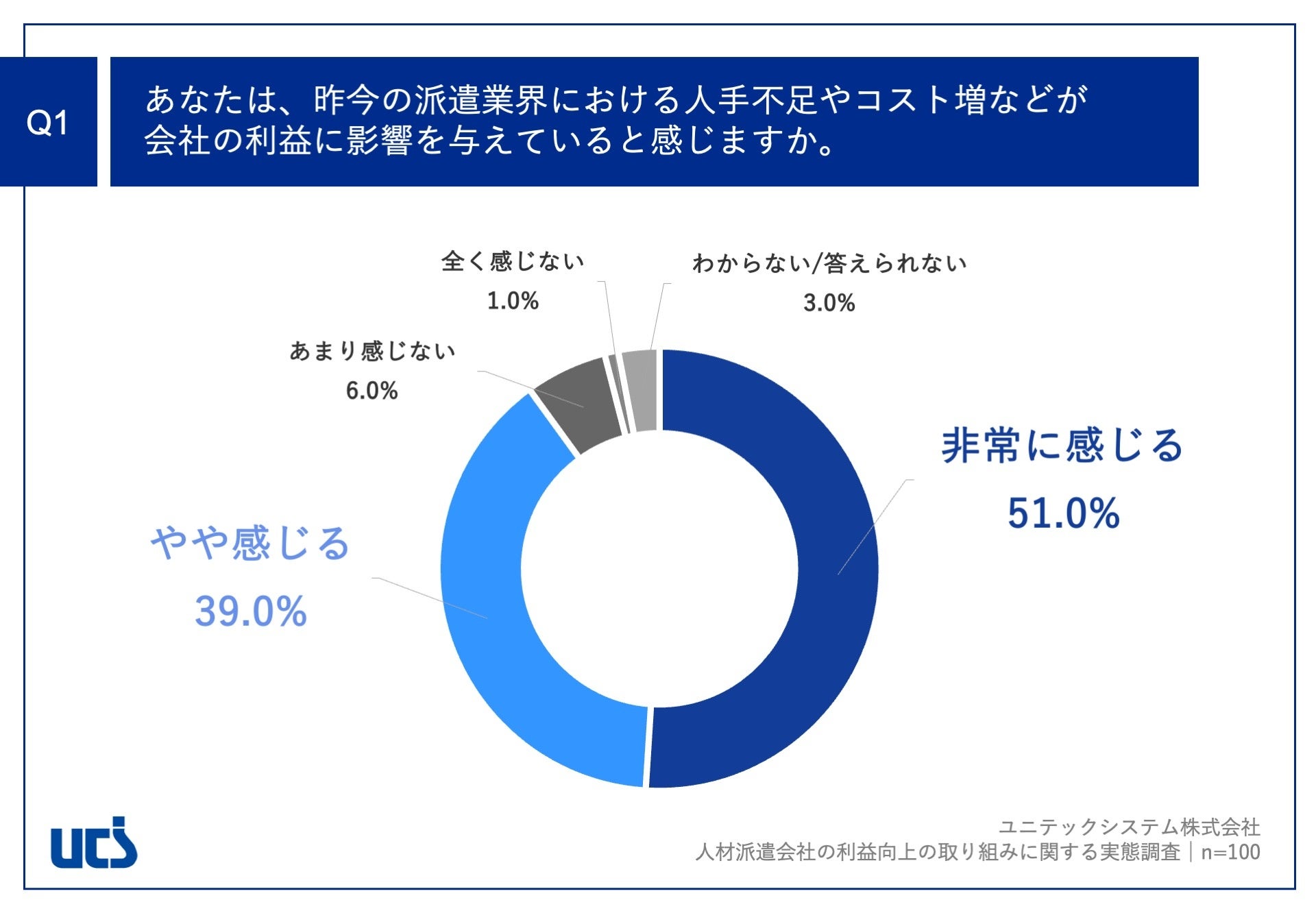 「Q1.あなたは、昨今の派遣業界における人手不足やコスト増などが会社の利益に影響を与えていると感じますか。」(n=100)と質問したところ、「非常に感じる」が51.0%、「やや感じる」が39.0%という回答となりました。