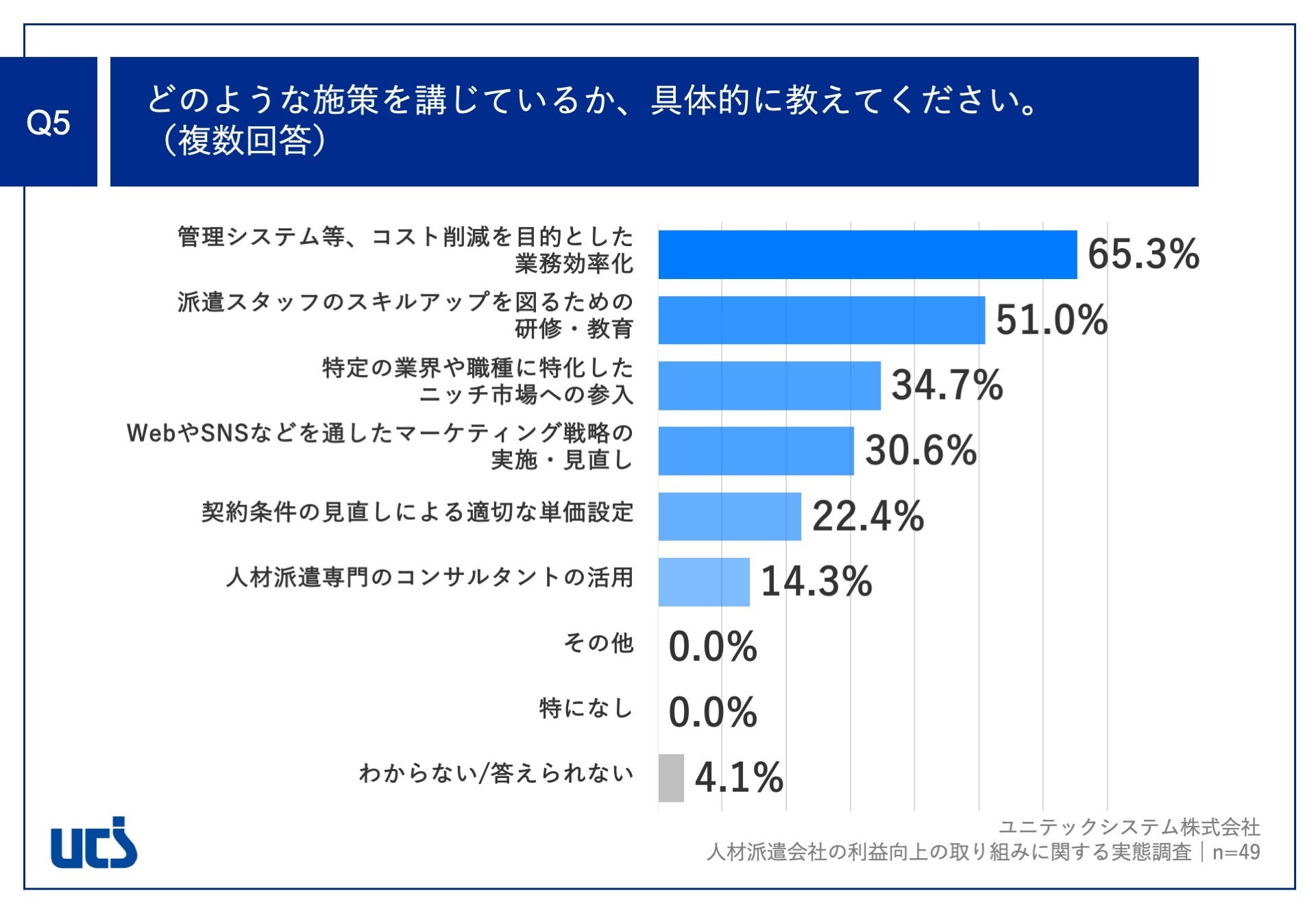 Q3で「既に取り組んでいる」と回答した方に、「Q5.どのような施策を講じているか、具体的に教えてください。(複数回答)」(n=49)と質問したところ、「管理システム等、コスト削減を目的とした業務効率化」が65.3%、「派遣スタッフのスキルアップを図るための研修・教育」が51.0%、「特定の業界や職種に特化したニッチ市場への参入」が34.7%という回答となりました。
