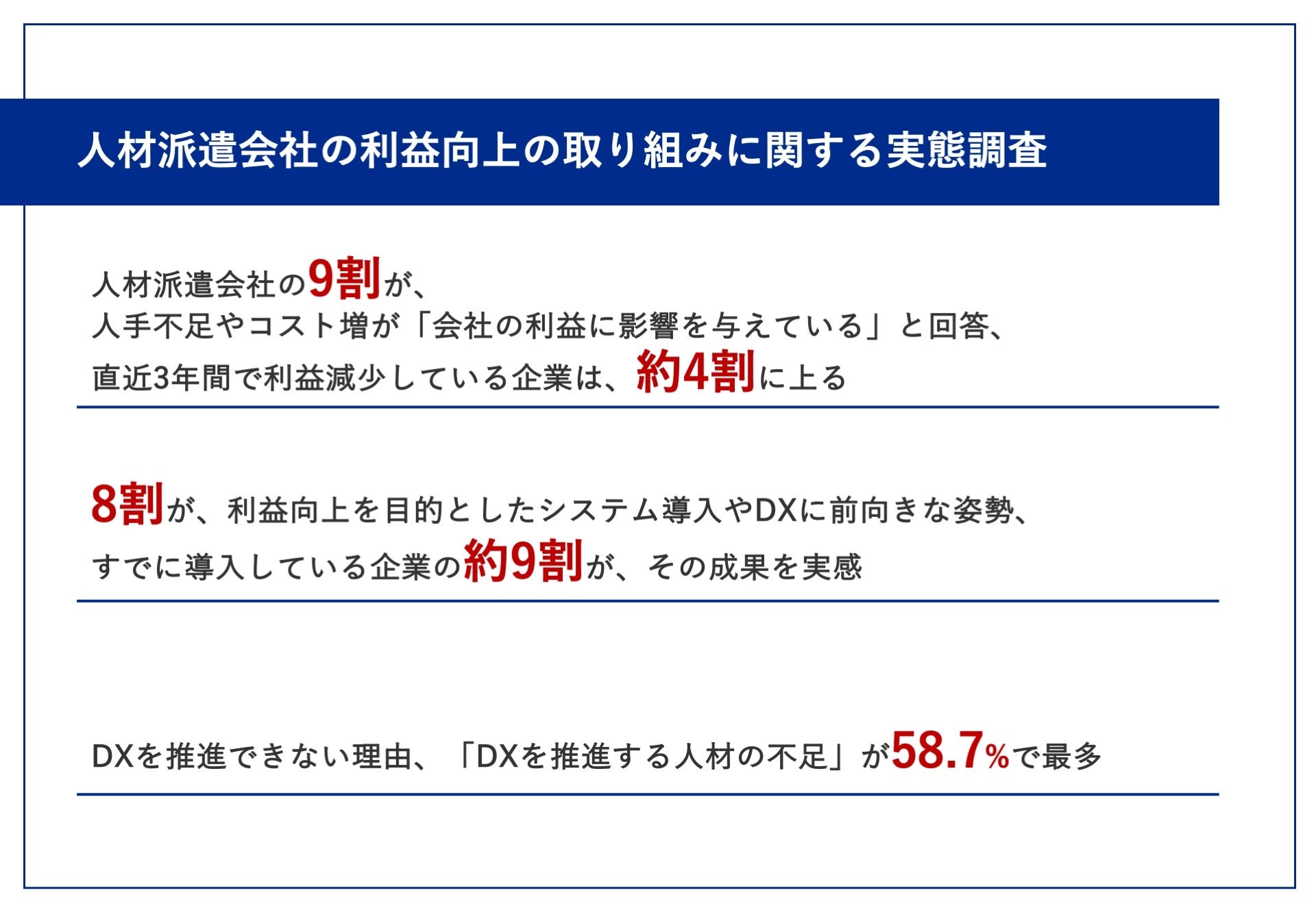 まず、人材派遣会社の9割が、人手不足やコスト増などが「会社の利益に影響を与えている」と感じており、約4割が、直近3年間で「利益が減少している」ことが分かりました。また、利益向上を目的としたシステム導入やDXについて、49.0%が「既に取り組んでいる」、31.0%が「これから取り組む予定である」と回答しています。さらに、すでにDXを進めている企業では、主に「派遣労働者(スタッフ)の管理」(65.3%)の領域で、「管理システム等、コスト削減を目的とした業務効率化」(65.3%)などの施策に取り組んでおり、約9割が、その成果を実感しています。最後に、これからDX推進したい企業の半数以上が、「派遣労働者(スタッフ)の管理」や「人材マッチング」(ともに51.6%)の領域で取り組みを検討している一方で、まだDXを推進できていない企業の理由としては、「DXを推進する人材が不足している」が58.7%で最多となりました。