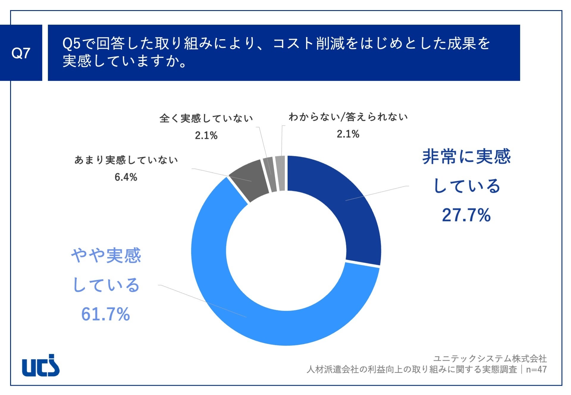 Q5で「特になし」「わからない/答えられない」以外を回答した方に、「Q7.Q5で回答した取り組みにより、コスト削減をはじめとした成果を実感していますか。」(n=47)と質問したところ、「非常に実感している」が27.7%、「やや実感している」が61.7%という回答となりました。
