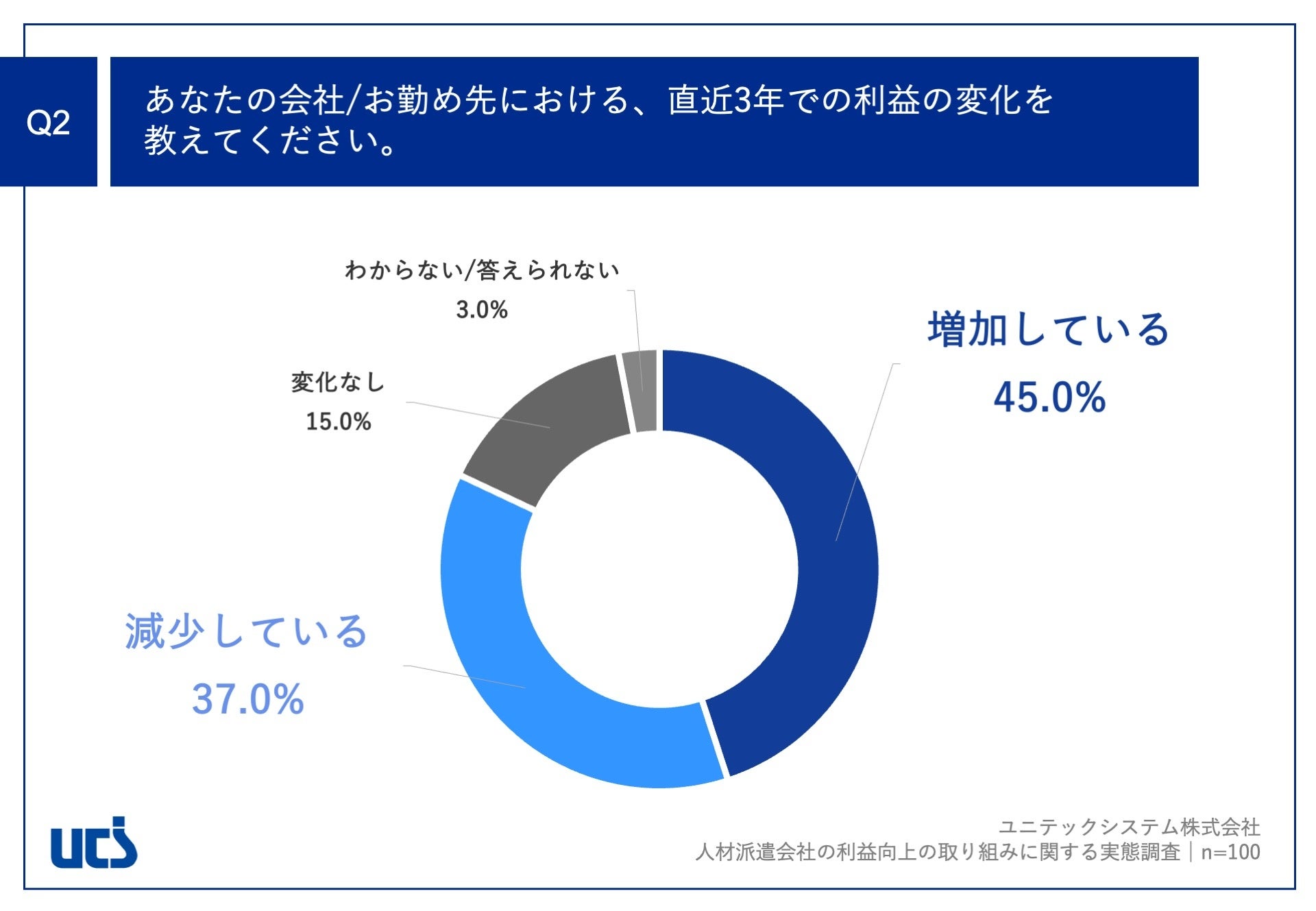 「Q2.あなたの会社/お勤め先における、直近3年での利益の変化を教えてください。」(n=100)と質問したところ、「増加している」が45.0%、「減少している」が37.0%という回答となりました。