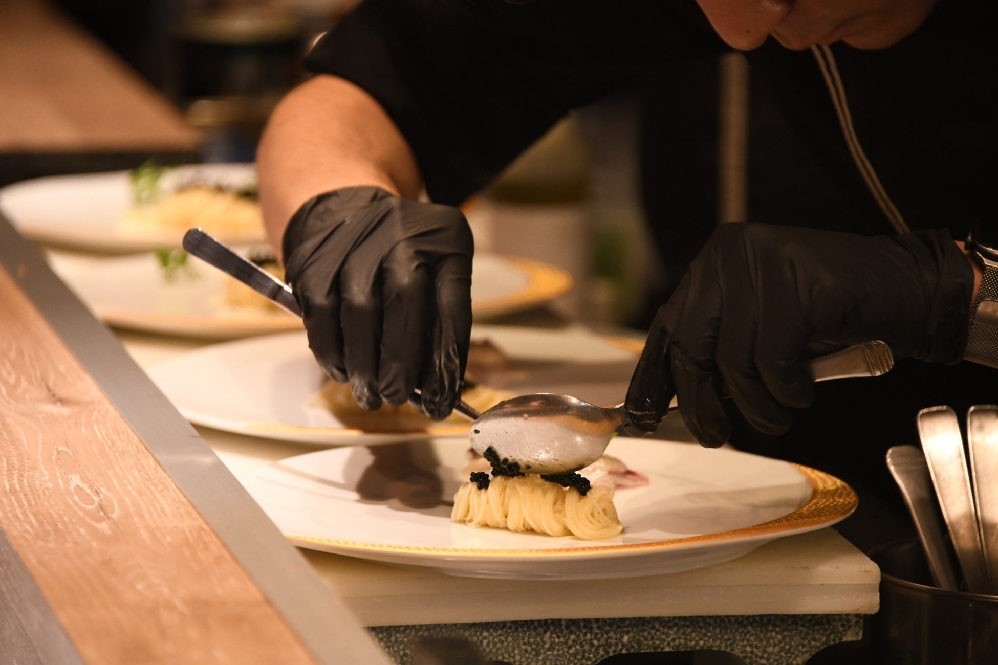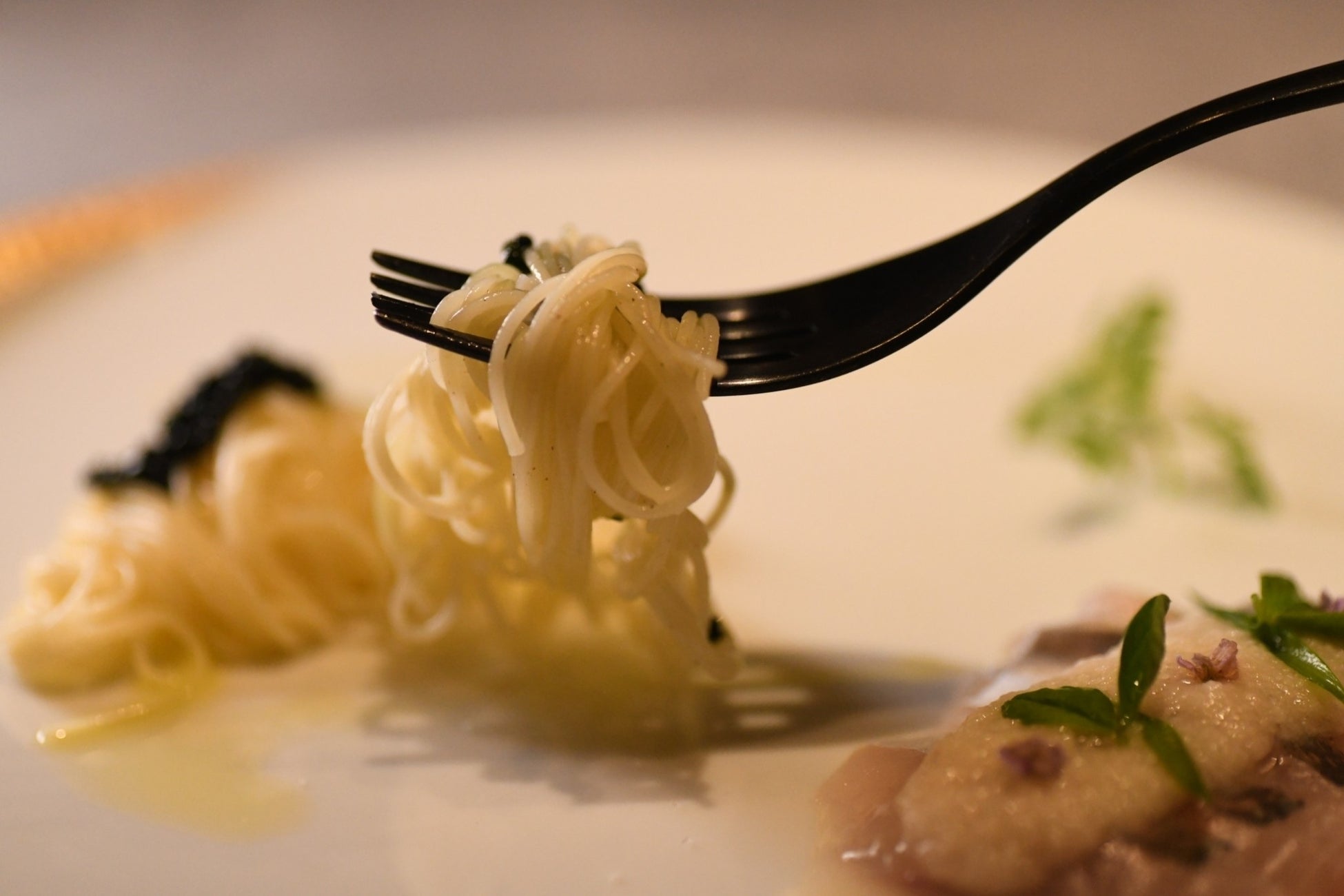 シンプルに仕上げたカッペリーニとコンディメントとして添えている北のキャビア、オリーブオイルを絡めていただきます。カルパッチョと合わせた素材の旨味を活かした一品です。