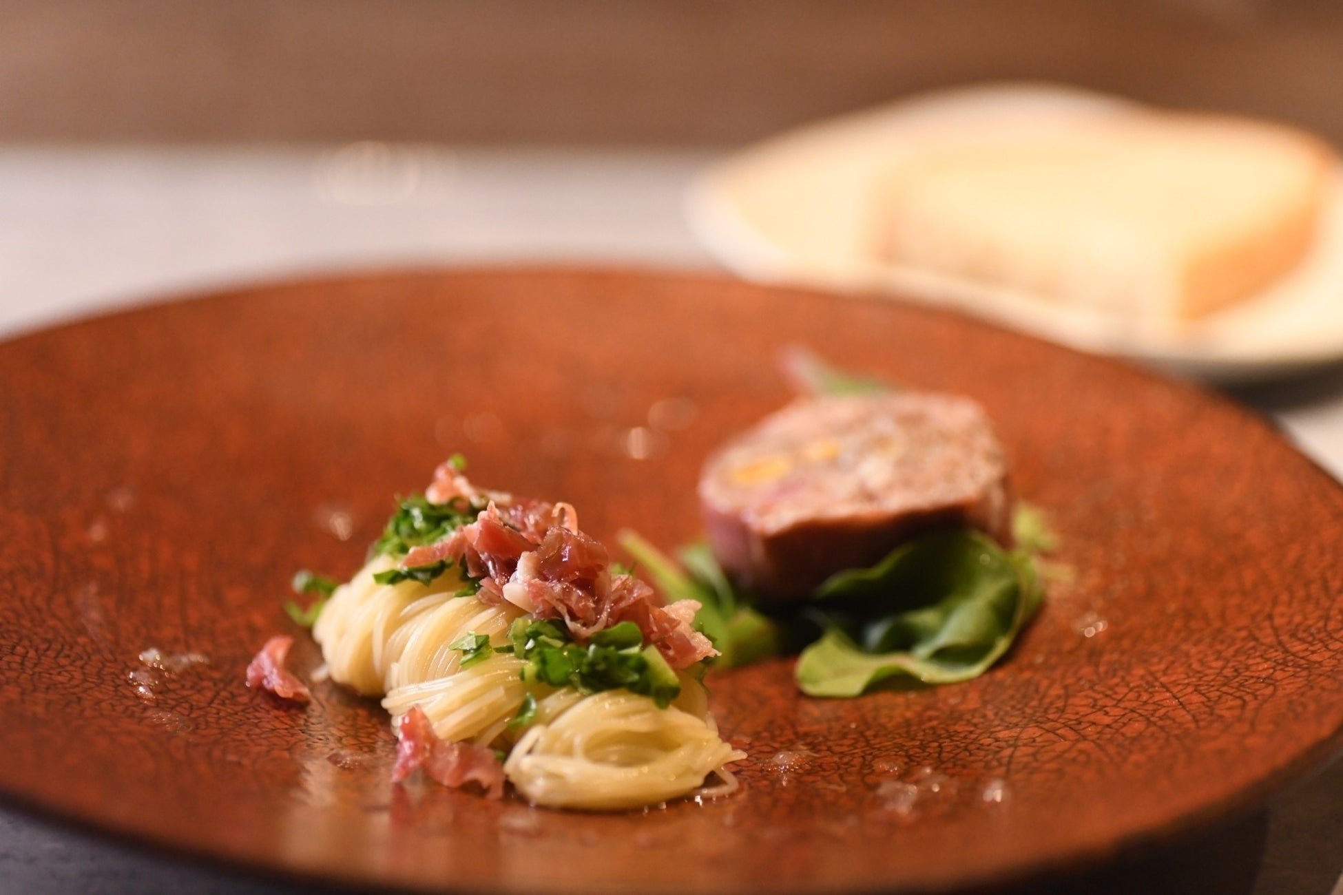 ■生ハムとルッコラのバジルレモン冷製カッペリーニ パテ・ド・カンパーニュ添え