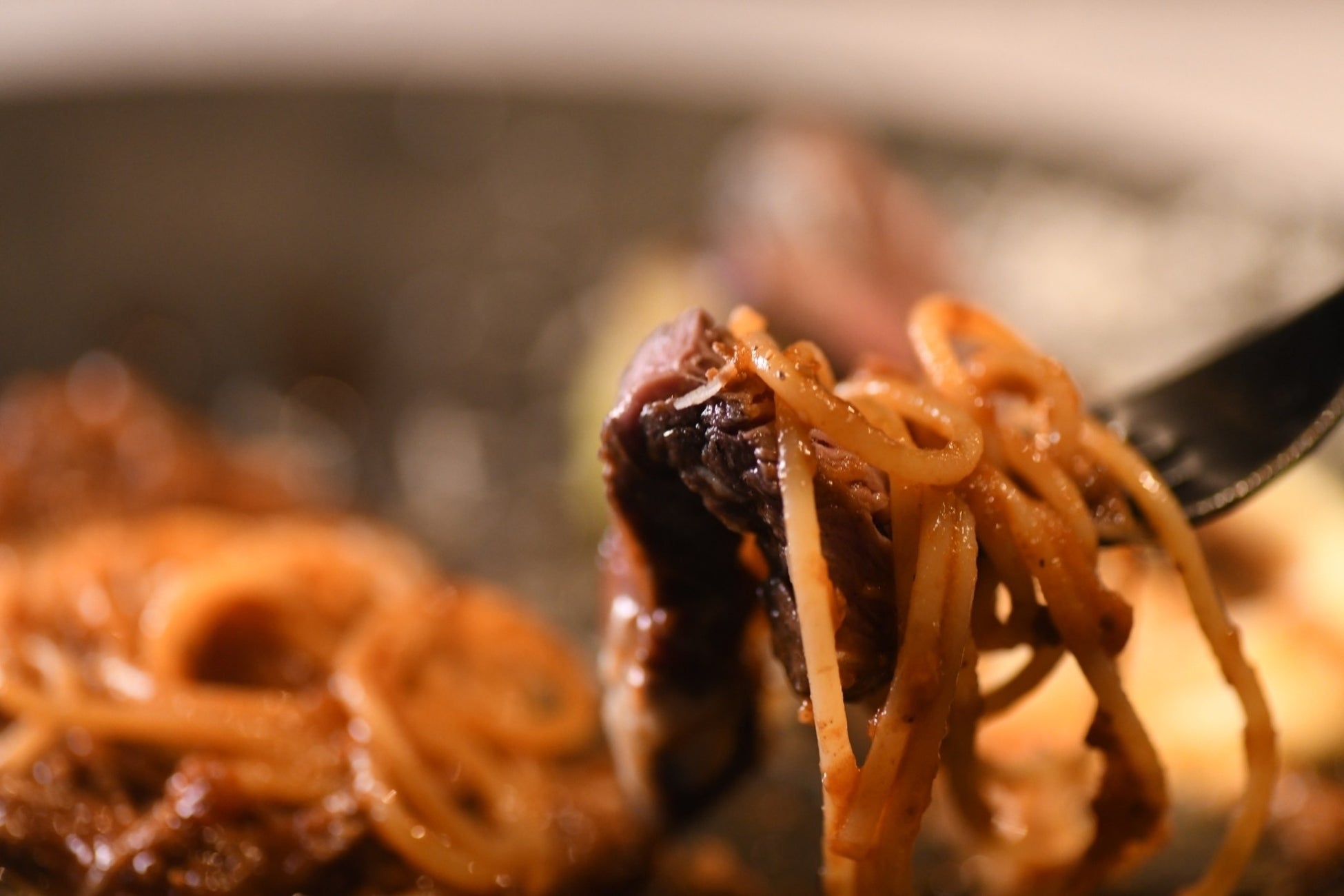 濃厚でコクのある辛口トマトソースがベースとなっており、粗挽きの肉の食感と炭火で焼いたステーキの風味が魅力の極上和牛ボロネーゼ。