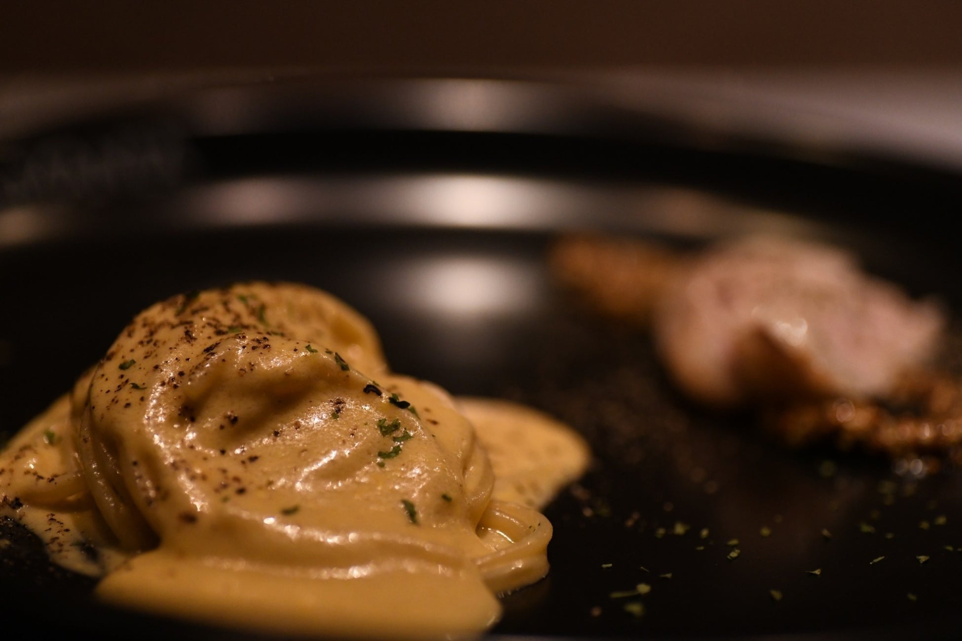 ■豚肩ロースのビステッカ 卵黄クリームソースカルボナーラ風
