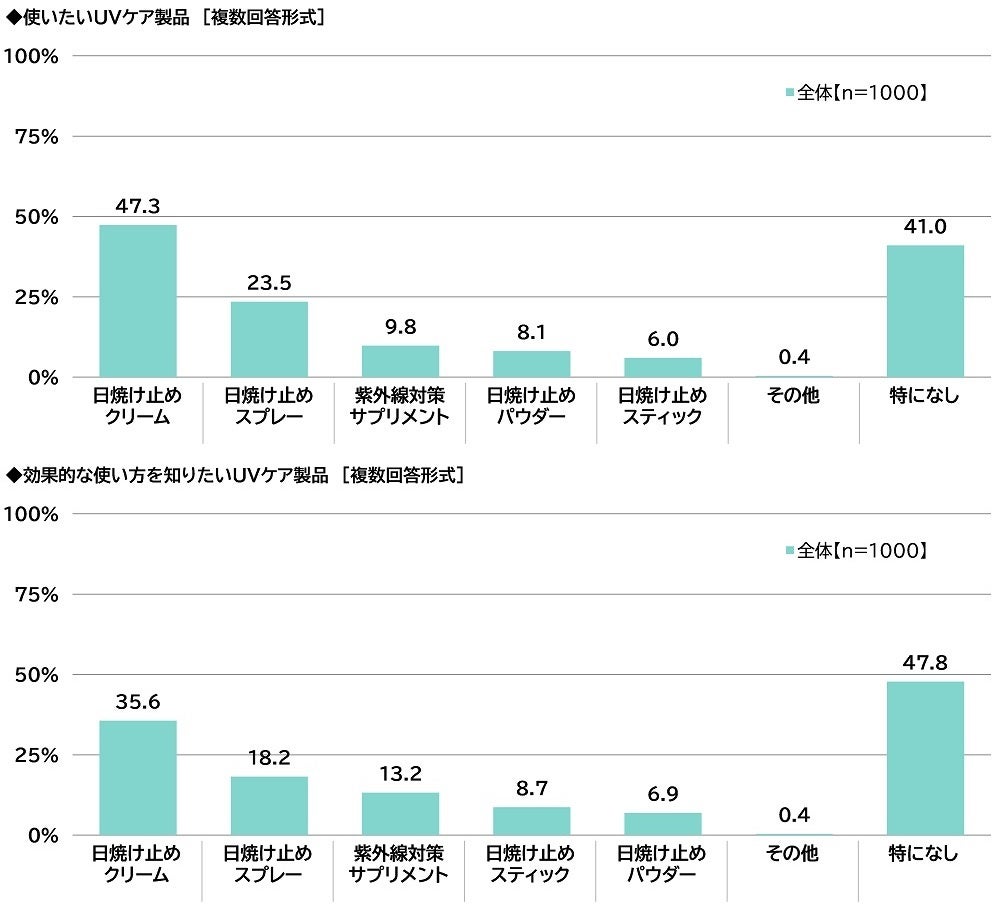 次に、全回答者(1,000名)に、使いたいUVケア製品を聞いたところ、1位「日焼け止めクリーム」(47.3%)、2位「日焼け止めスプレー」(23.5%)、3位「紫外線対策サプリメント」(9.8%)となりました。