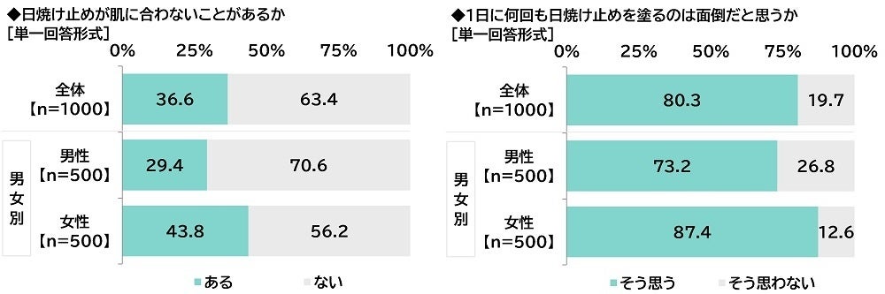 男女別にみると、女性では日焼け止めが肌に合わないことがあると回答した人の割合は43.8%、1日に何回も日焼け止めを塗るのは面倒だと思うと回答した人の割合は87.4%と、男性(順に29.4%、73.2%)と比べて10ポイント以上高くなりました。