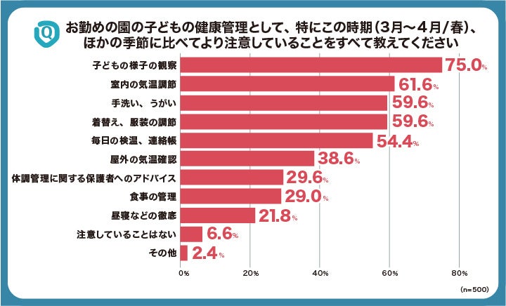 また、「子どもの健康管理として、この時期(3月〜4月/春)、他の季節と比べて特に注意していることをすべて教えてください」と聞いたところ、1位が「子どもの様子の観察」で75.0%と最も高く、次いで2位が「室内の気温調節」で61.6%、3位が同率で「手洗い・うがい」、「着替え、服装の調節」で59.6%となり、基本的な生活習慣や体温調節などに気を配っていることが分かりました。その理由としては、「花粉症で目が痒くなったり、アレルギーがひどい子がいるため」や「感染症が多い季節で、最近はコロナウイルスやはしか、インフルエンザなどがこの時期でも増えているから」といった花粉症や感染症へのケアの他、「年度末、年度始めでバタバタしてるので子どもたちの生活リズム等の変化や室内室外の気温差などの影響を受けがち」などの理由も見られました。