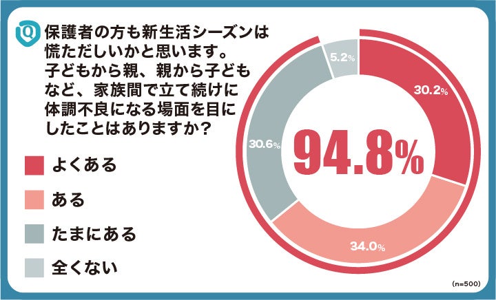 また、「子どもの体調不良が続く場面を目にしたことはあるか」という質問では、「よくある」が43.4%と約半数、「ある」31.4%と「たまにある」の21.8%をあわせると96.6%と、ほぼ全員の保育士が経験をしていることがわかりました。子どもだけでなく家族間で続く体調不良についても聞いたところ、「よくある」が30.2%、「ある」が34.0%と「たまにある」の30.6%をあわせると94.8%と、こちらもほぼ全員が子どもから親、親から子どもなどの家庭内感染により続く体調不良を経験。保護者のライフスタイルの変化も多い新年度は、子どもだけでなく、家族全員の体調管理の重要性がうかがえます。