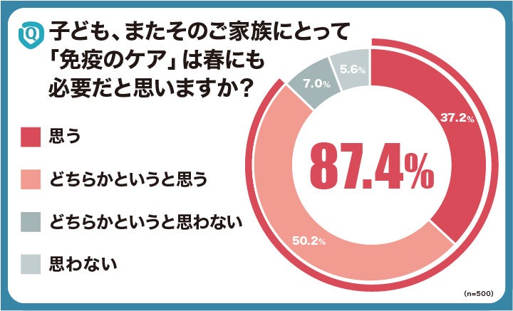 最後に、「子どもやそのご家族にとって免疫のケアは春にも必要か」を尋ねたところ、「思う」が37.2%、「どちらかと言えば思う」が50.2%となり、合わせて約9割が、春の季節の免疫のケアの重要性を認識していることが分かりました。
