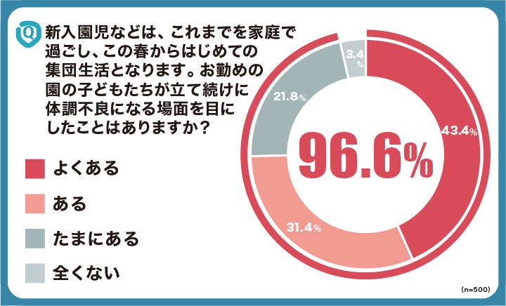 また、ほぼ全員(96.6%)の保育士が、実際に子どもの体調不良が続くことを体験していると回答。