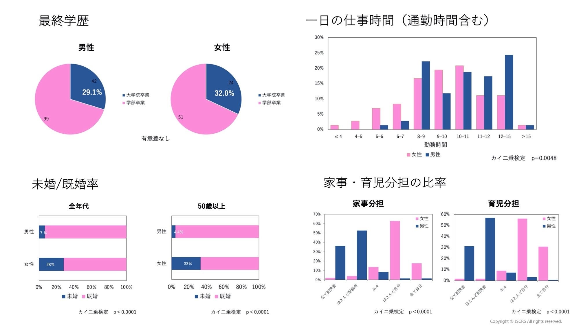 職種、労働時間、年収、結婚率、子供の数は男女で大きく異なった。 女性の回答者は家事、育児、看護に対してより大きな責任を負っていたが、男性医師の配偶者の多くは仕事をしていないか、勤務時間が短く、収入が低く、配偶者が家庭での責任を多く負っていた。 女性の回答者は男性の回答者よりも、出産後に仕事を変更する頻度が高かった。 男女とも眼科という職業選択に等しく満足していた。 しかし、学生や子どもに職業として眼科を勧める女性は男性に比べて少なかった。 日本の眼科医の間では、家族に対する責任という点で大きな性差があった。