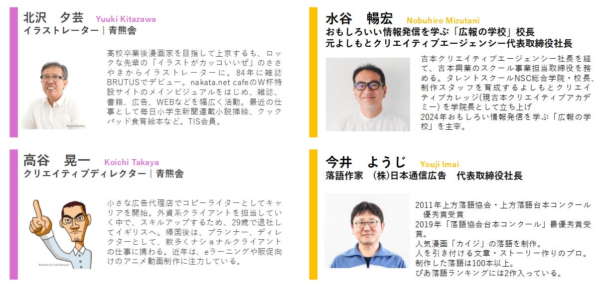 『WARABU』の制作チームはこちら。数々の雑誌、書籍、広告、WEBなどのイラストを手掛けられているイラストレーターの北沢夕芸氏(青熊舎)、クリエイティブディレクターの高谷晃一氏(青熊舎)、元よしもとクリエイティブ・エージェンシー社長であり、おもしろい情報発信を学ぶ「広報のがっこう」を主宰する水谷暢宏、落語作家の今井ようじ氏の4名が率いるチームで制作しています。